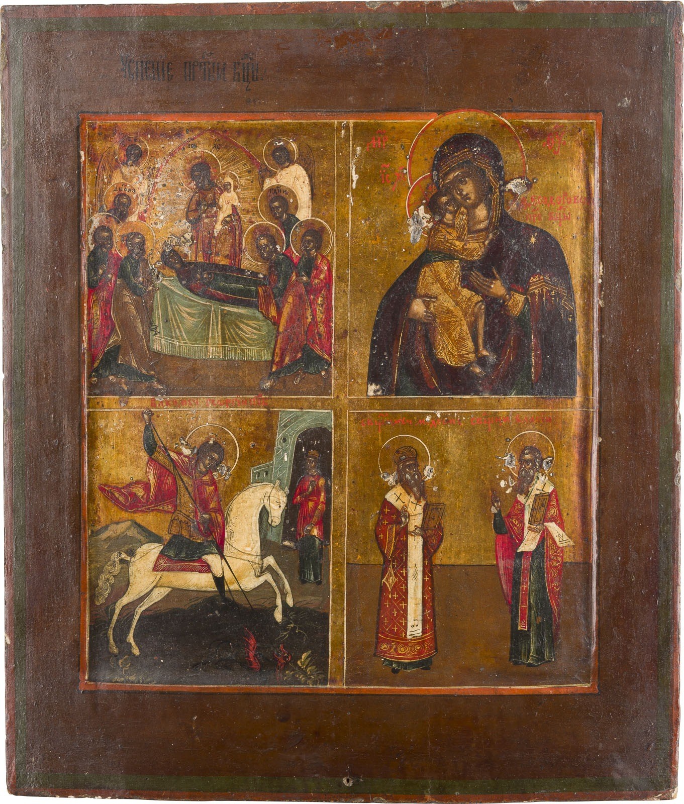 A QUADRI-PARTITE ICON SHOWING THE DORMITION OF THE MOTHER OF GOD, THE FEODOROVSKAYA MOTHER OF GOD AND SELECTED SAINTS Russian, 19th century Tempera on wood panel with kovcheg. The background made of silver, covered by a golden lacquer. Minor losses, partially restored. 35 x 30.1 cm.