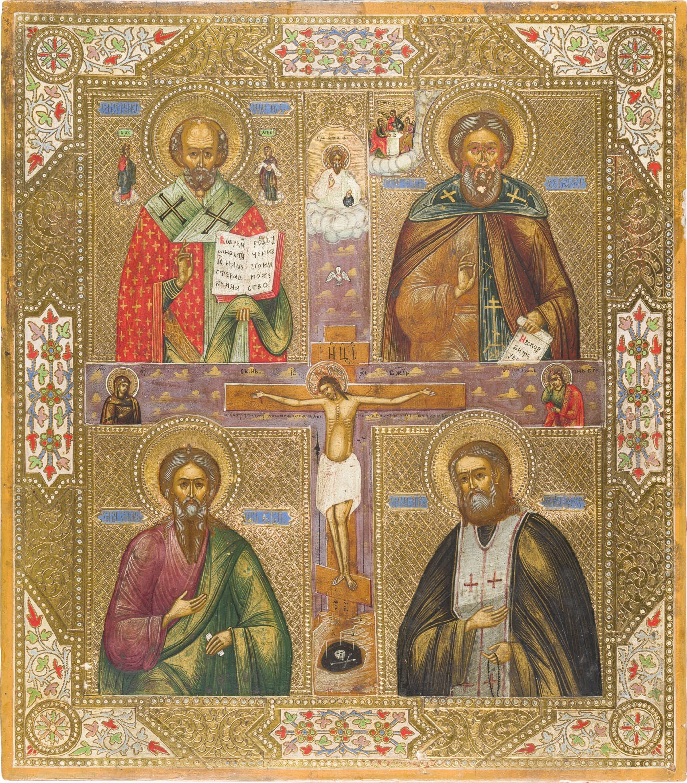 A QUADRI-PARTITE ICON SHOWING THE CRUCIFIXION AND FOUR SELECTED SAINTS Russian, after 1903 Tempera on wood panel. Against a tooled background, the patterns of spandrels and borders emulating contemporary metal oklad. Minor paint losses. 35.3 x 31.4 cm.