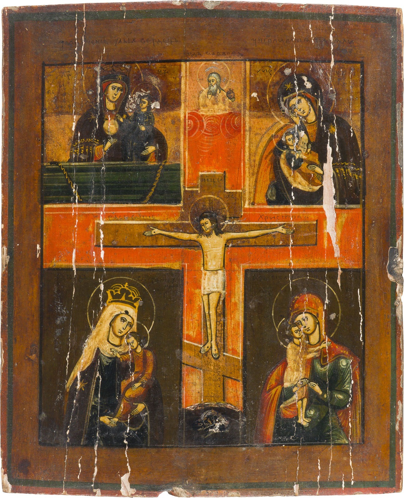 VIERFELDER-IKONE MIT DER KREUZIGUNG UND VIER GNADENBILDERN DER GOTTESMUTTER