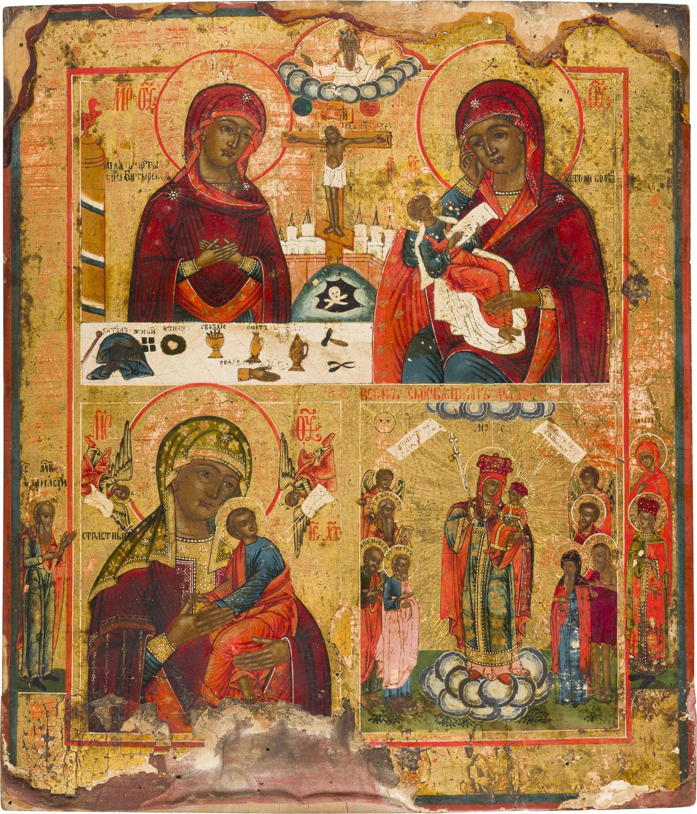 A QUADRI-PARTITE ICON SHOWING FOUR IMAGES OF THE MOTHER OF GOD Russian, Vetka, mid-19th century Tempera on wood panel over canvas, gold ground. With three saints on the borders. Some losses to the borders. 36 x 30.7 cm.