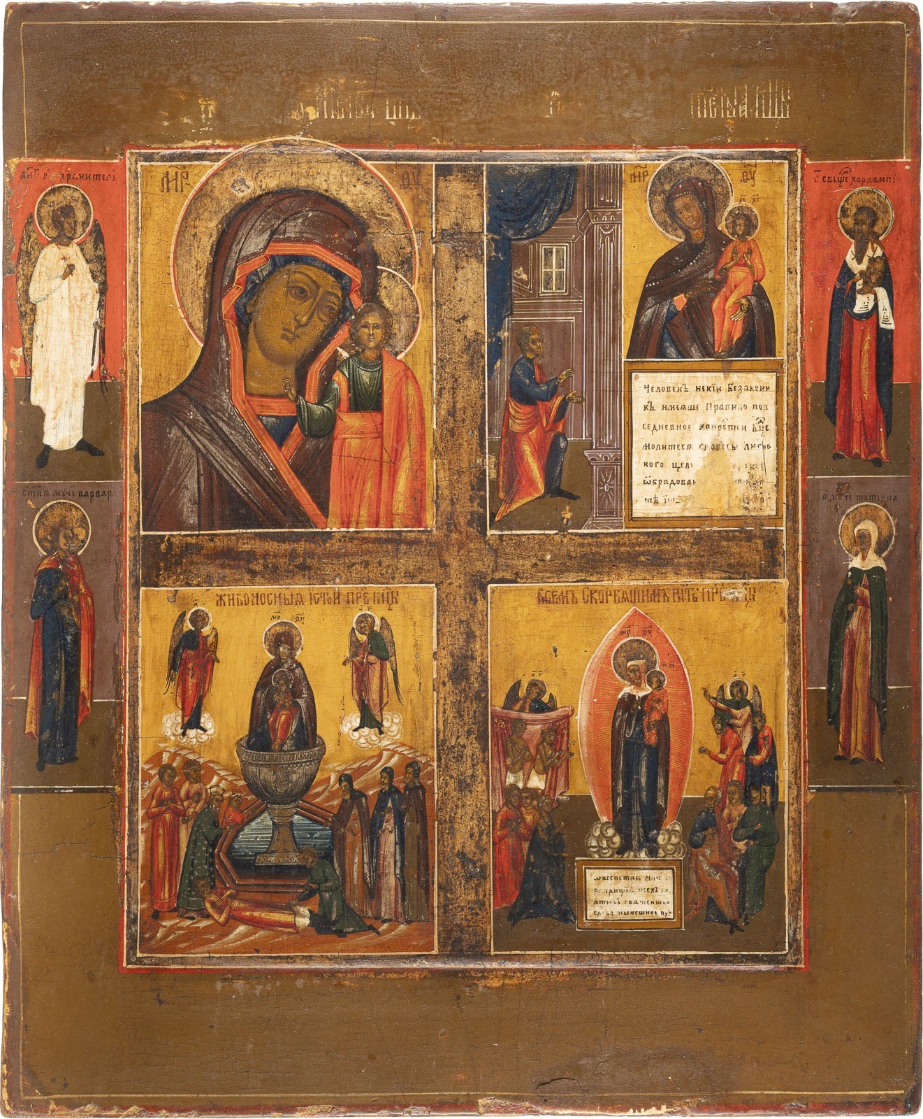 A QUADRI-PARTITE ICON SHOWING FOUR IMAGES OF THE MOTHER OF GOD Russian, mid-19th century Tempera on wood panel with kovcheg. The haloes with traces of gilding. Four selected saints on the borders: Guardian Angel, Sts. Barbara, Haralampos and Tatiana. Wearings, restorations. 35.2 x 29.7 cm.