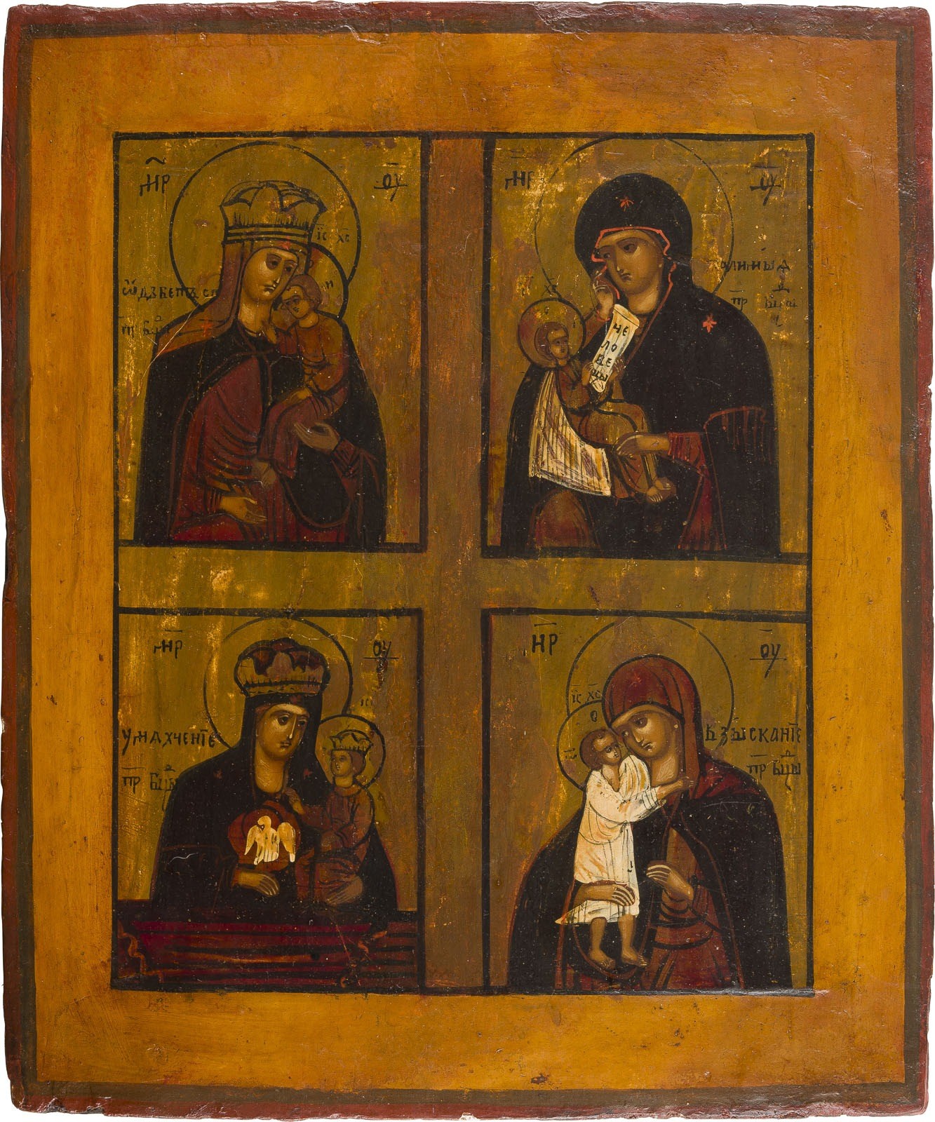 A QUADRI-PARTITE ICON SHOWING FOUR IMAGES OF THE MOTHER OF GOD Russian, mid 19th century Tempera on wood panel. Restorations. 30.7 x 26.2 cm.