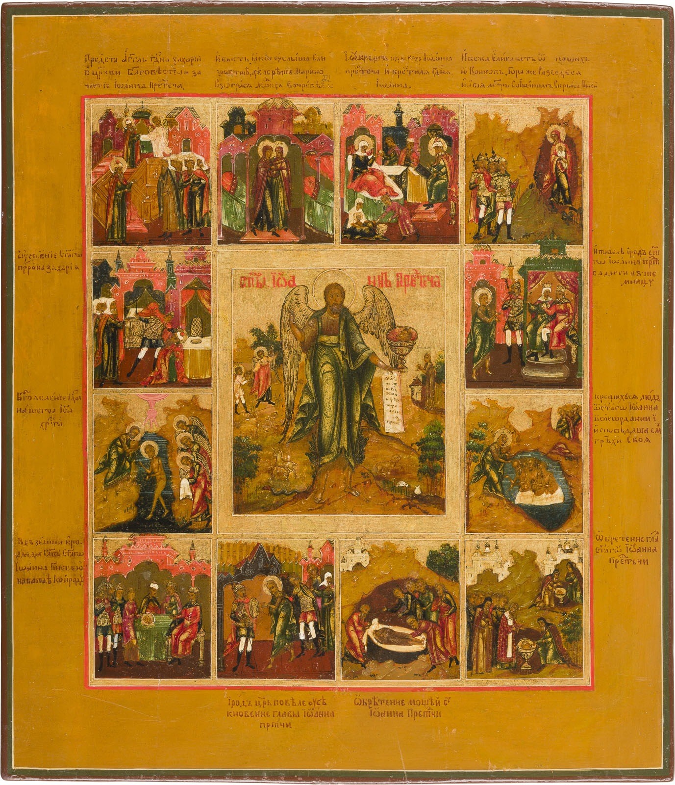 A FINE VITA ICON OF ST. JOHN THE FORERUNNER WITH TWELVE SCENES FROM HIS LIFE Central Russian, circa 1800 Tempera on wood panel. Finely executed in great detail on a gold ground. Minimally restored. 35.6 x 30.5 cm.