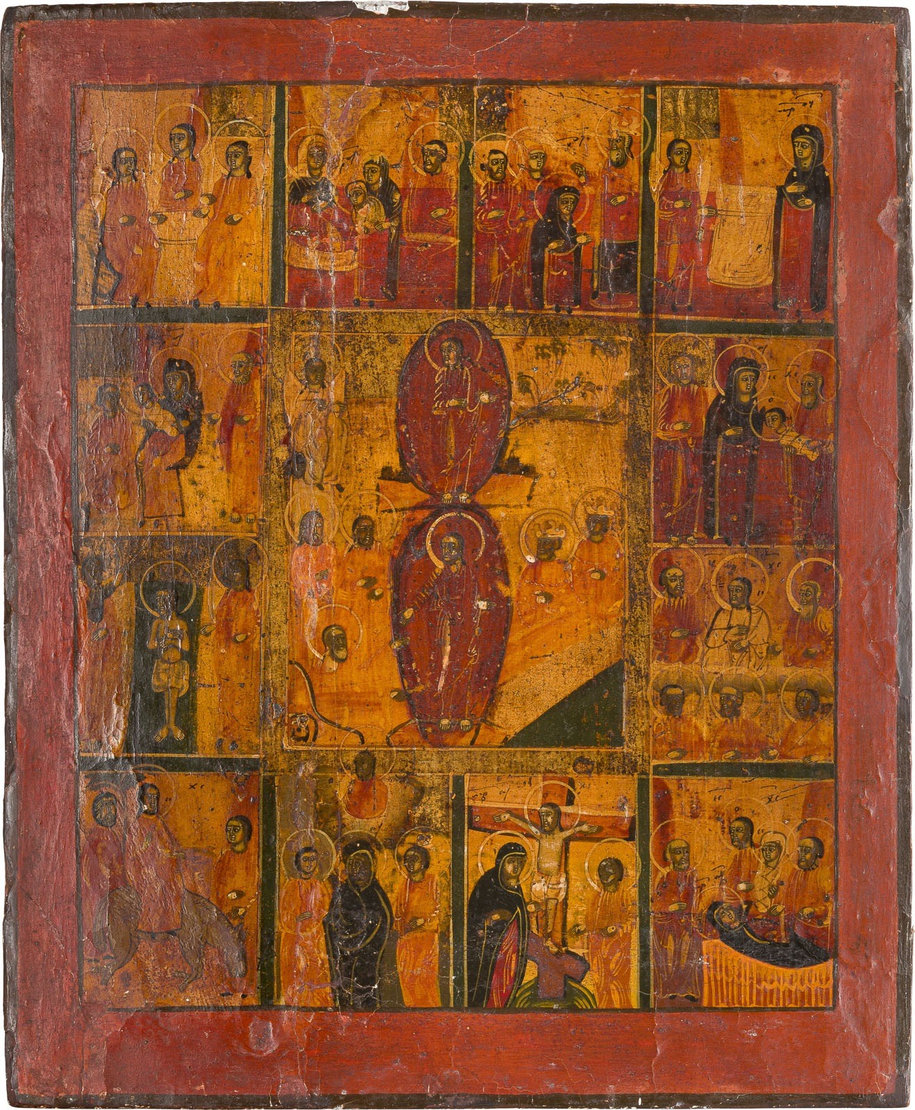 TWO FEAST DAY ICONS Russian, 19th/20th century Tempera on wood panels. Partially restored, paint blisterings. 35 x 29.8 cm / 37.8 x 31.4 cm.