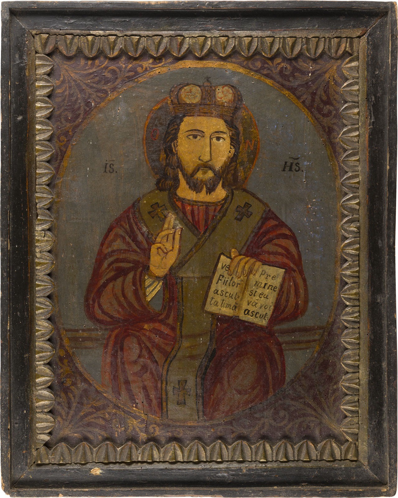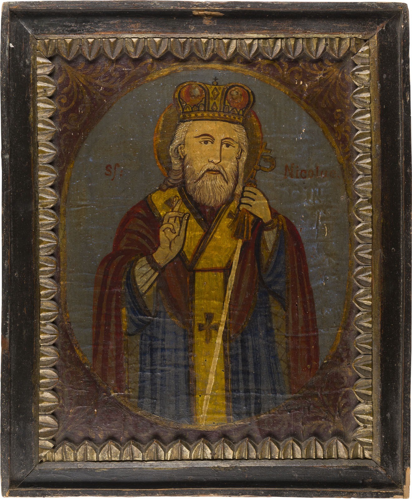 TWO LARGE ICONS SHOWING CHRIST PANTOKRATOR AND ST. NICHOLAS OF MYRA Romanian, 19th century Oil on wood panel. Within a carved foliage frame. 58 x 48 cm.
