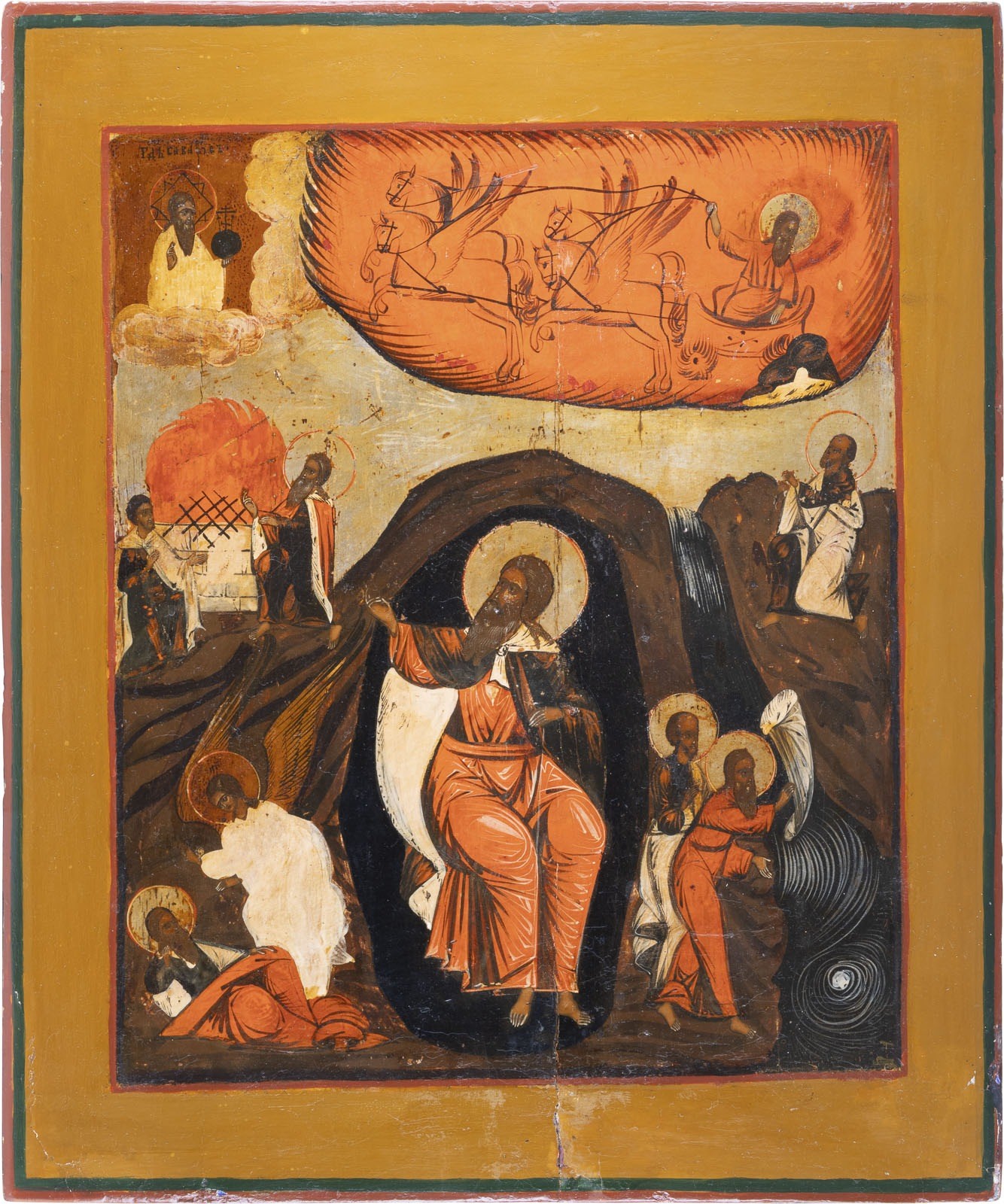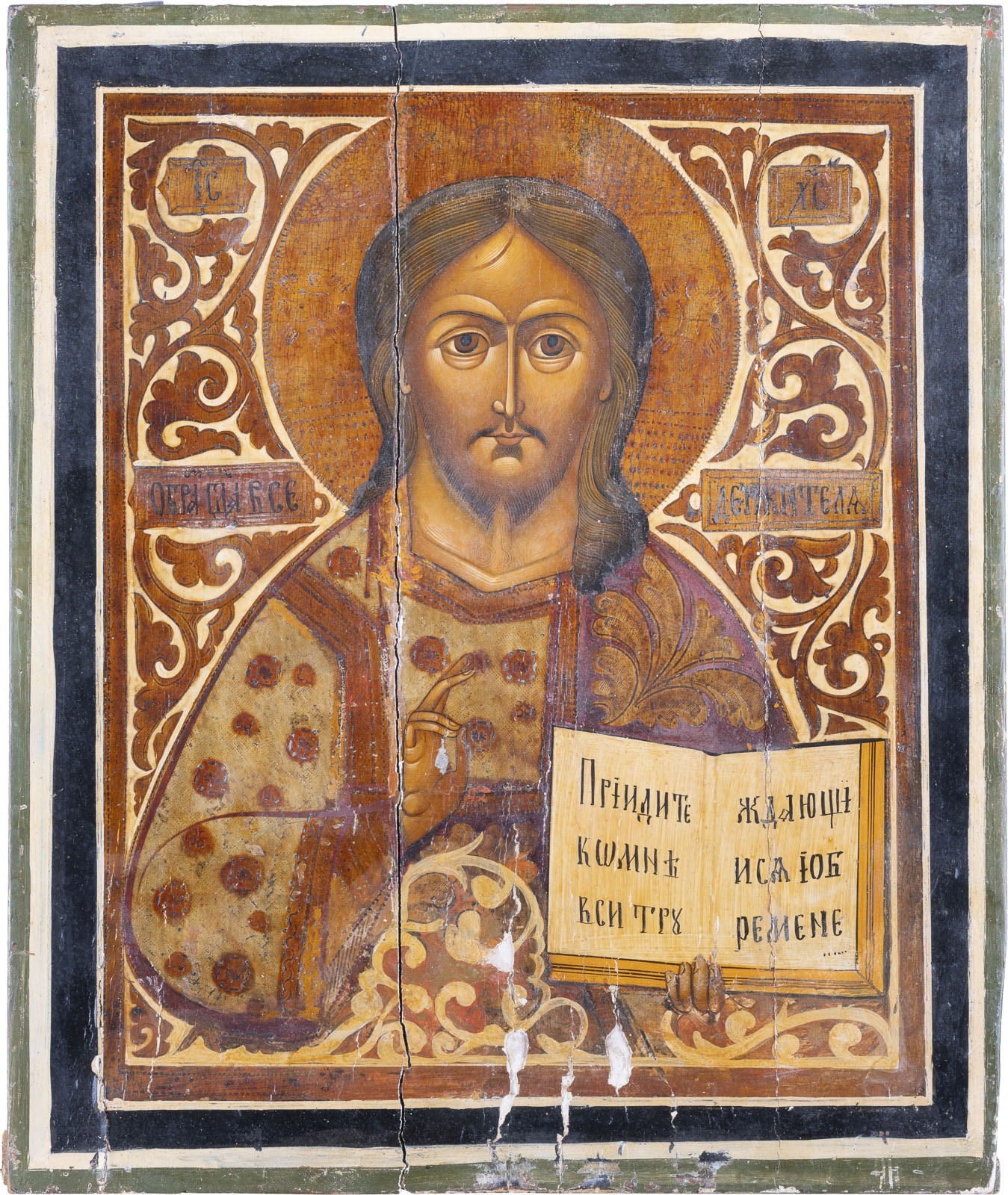 TWO LARGE ICONS SHOWING CHRIST PANTOKRATOR AND THE PROPHET ELIJAH Russian, 18th/19th century Tempera on wood panels. The background made of silver, covered by a golden lacquer. Vertical cracks, losses, restored. 39.8 x 33 cm / 43.7 x 37 cm.