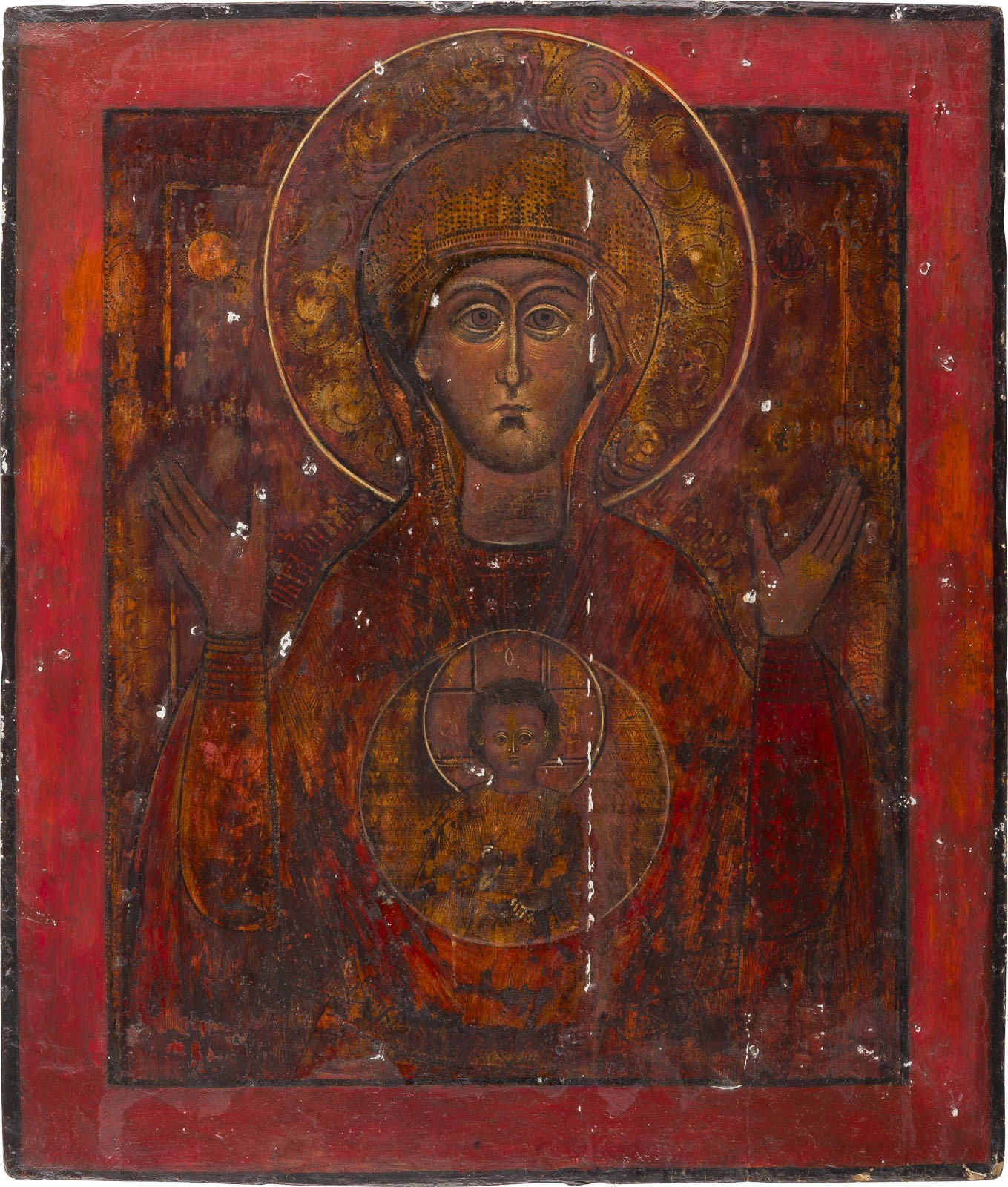 TWO LARGE ICONS SHOWING THE MOTHER OF GOD OF THE SIGN AND THE THREE-HANDED MOTHER OF GOD Russian, 19th century Tempera on wood panels. The background made of silver, covered by a golden lacquer. The garments ornately incised. Losses, damages, restored. 47 x 40.4 cm / 40.8 x 33.2 cm.