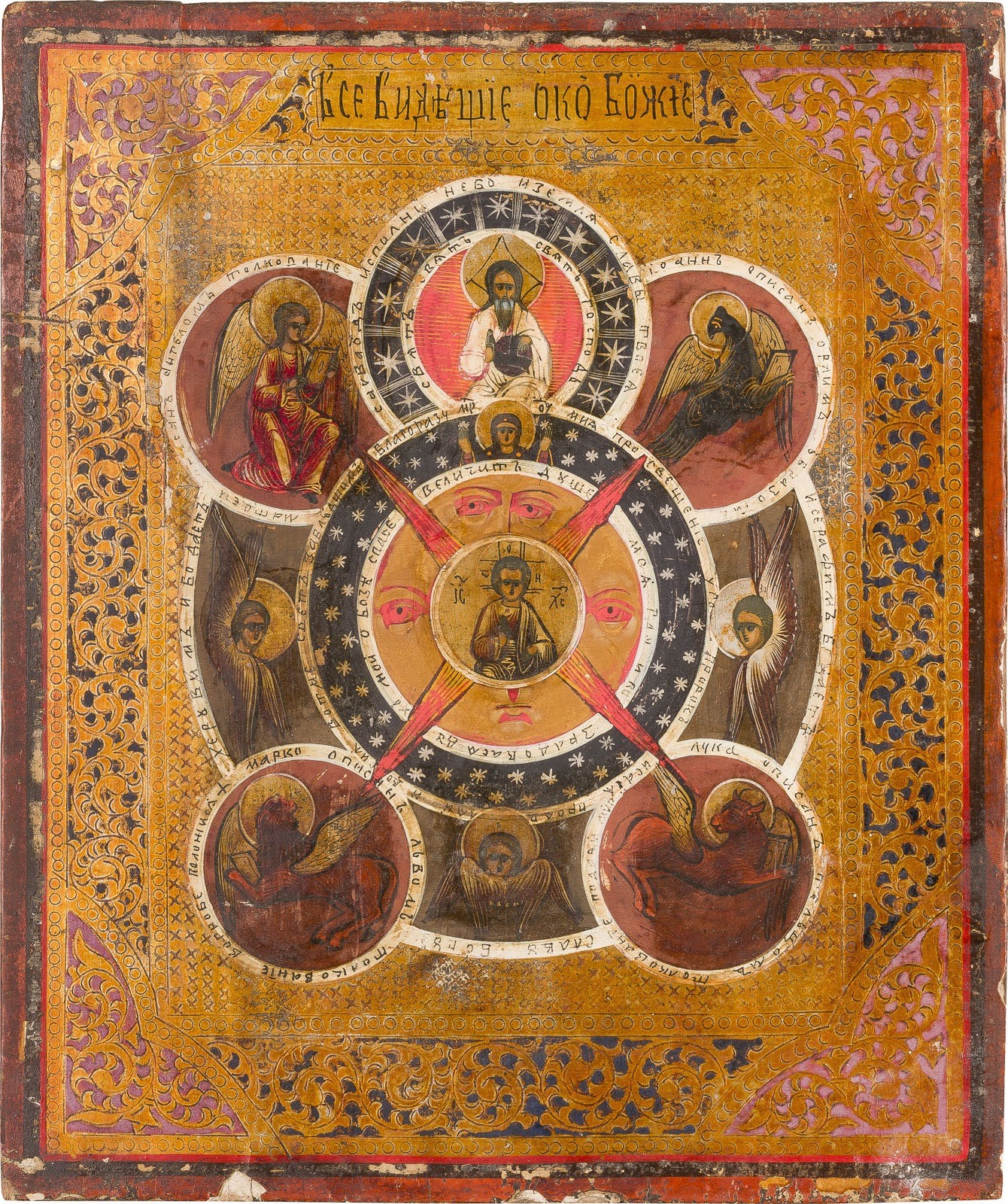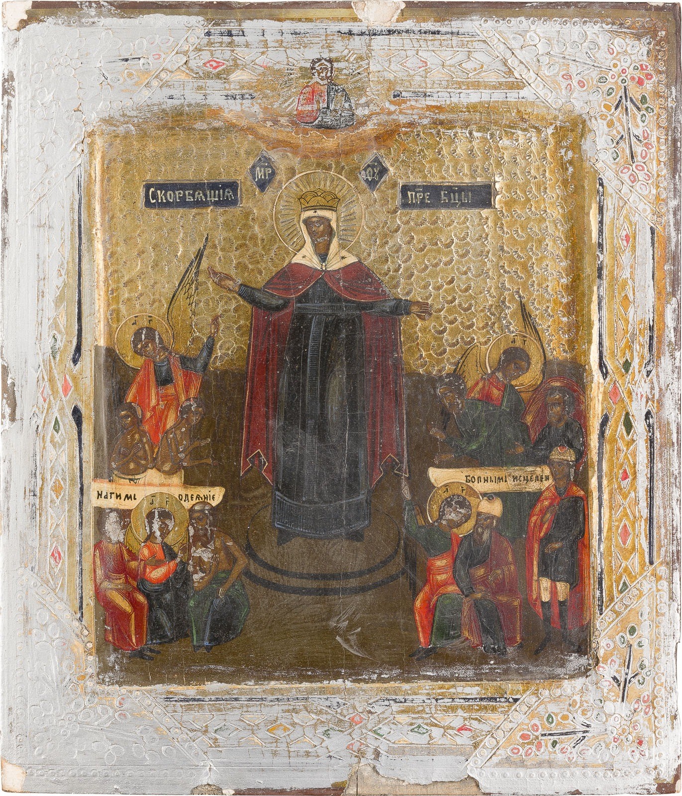 TWO ICONS SHOWING THE 'ALL-SEEING EYE OF GOD' AND THE MOTHER OF GOD 'JOY TO ALL WHO GRIEVE' Russian, late 19th century Tempera on wood panels. The background made of silver, covered by a golden lacquer. The background ornately incised. The borders ornately incised and painted in faux enameling. Losses, damages. 31.1 x 26.2 cm / 31.2 x 26.5 cm.