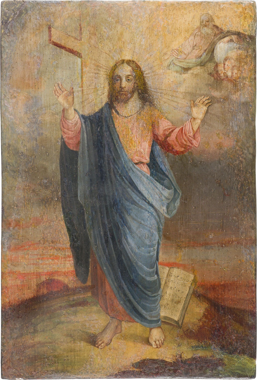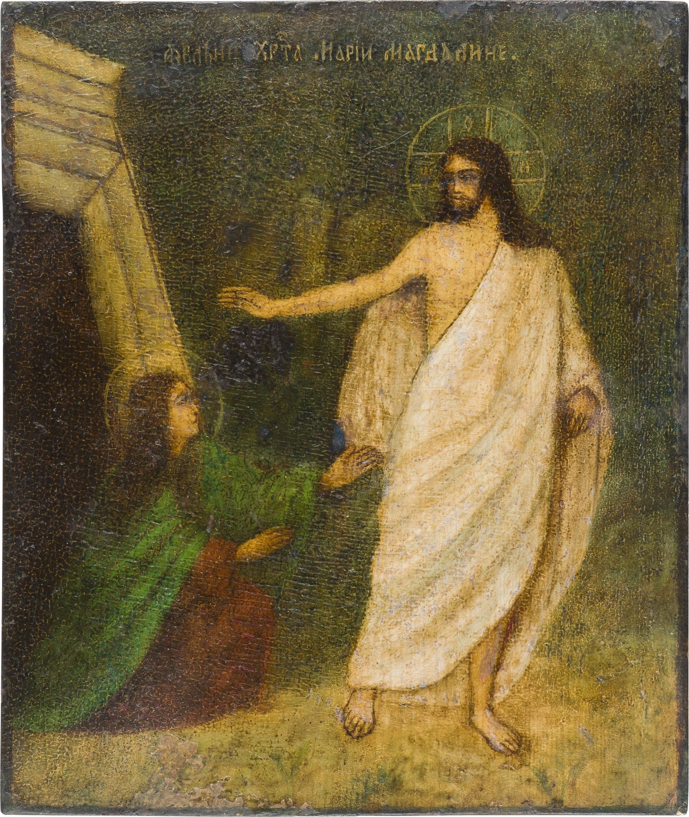 TWO ICONS: CHRIST PANTOCRATOR AND 'NOLI ME TANGERE' Russian, 19th/20th century Oil on wood panels. Modern overpainting and restorations. 35.5 x 23.8 cm / 31 x 26.3 cm.
