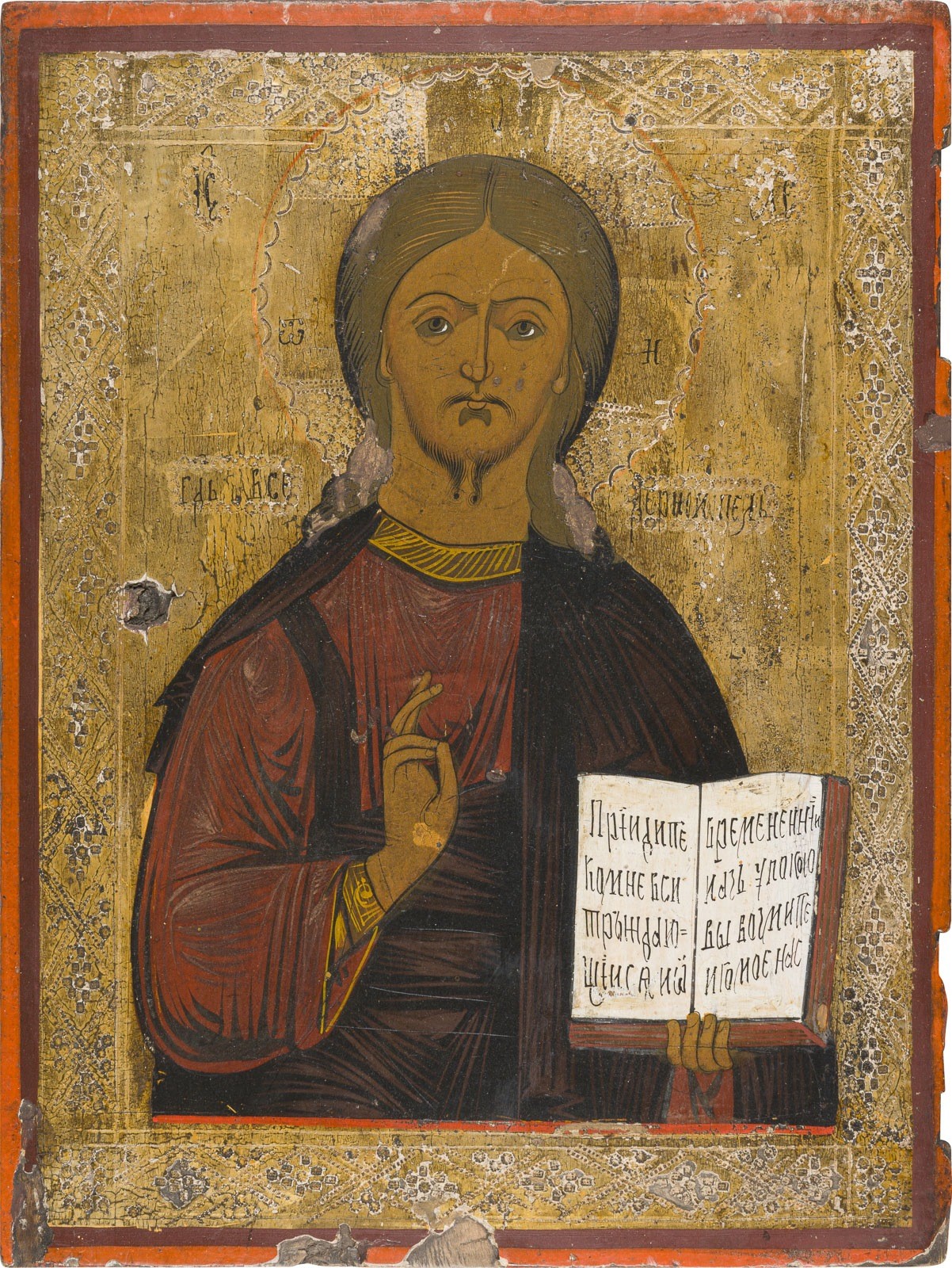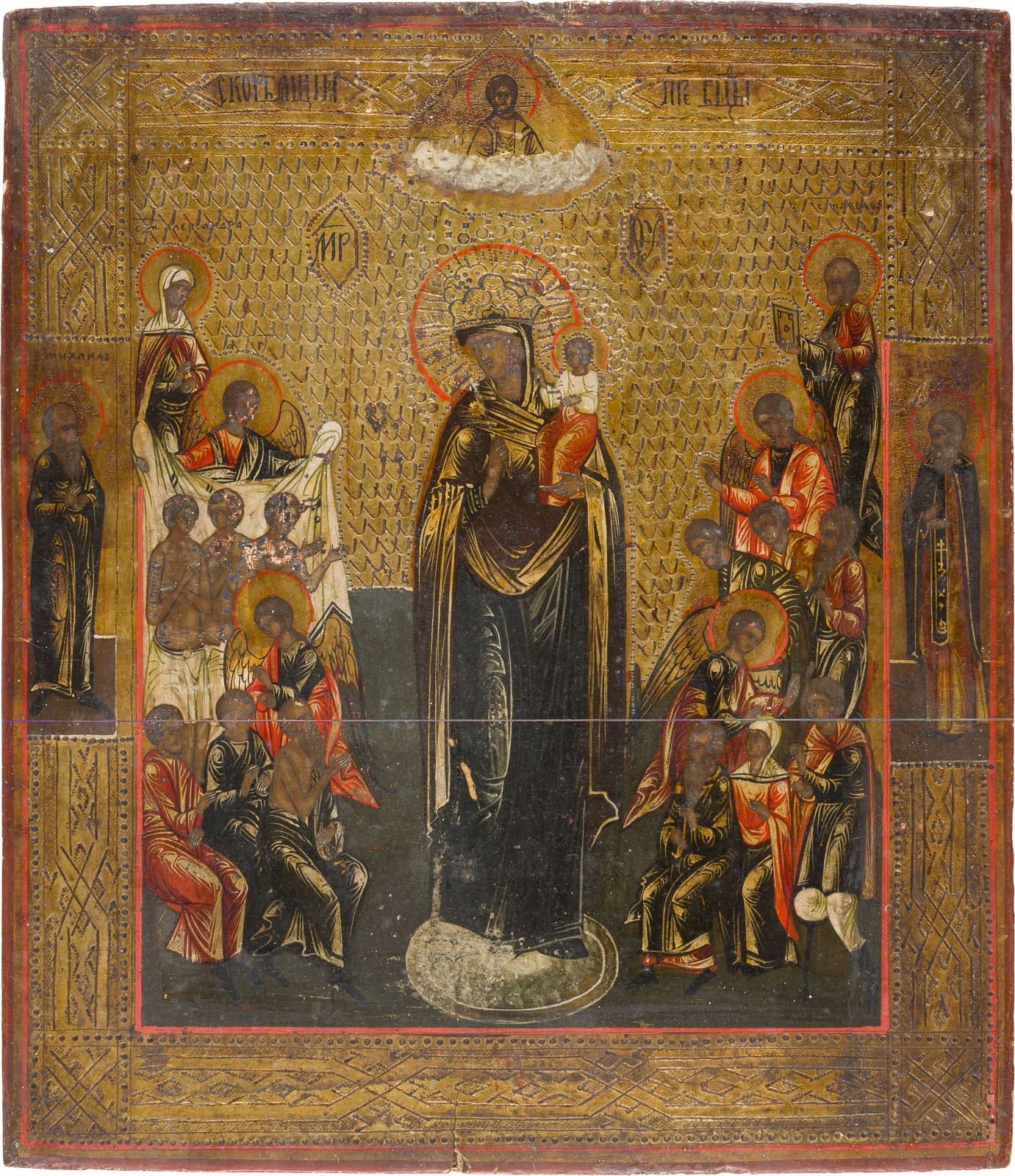 TWO ICONS SHOWING CHRIST PANTOKRATOR AND THE MOTHER OF GOD 'JOY TO ALL WHO GRIEVE' Russian, late 19th century Tempera on wood panel. The background made of silver, covered by a golden lacquer. The border and background incised to resemble a chased gilded silver oklad. One icon with two family patrons on the borders: Mikhail and Sergey. Minor losses, partially worn. 36.1 x 27.4 cm / 30.6 x 26.8 cm.