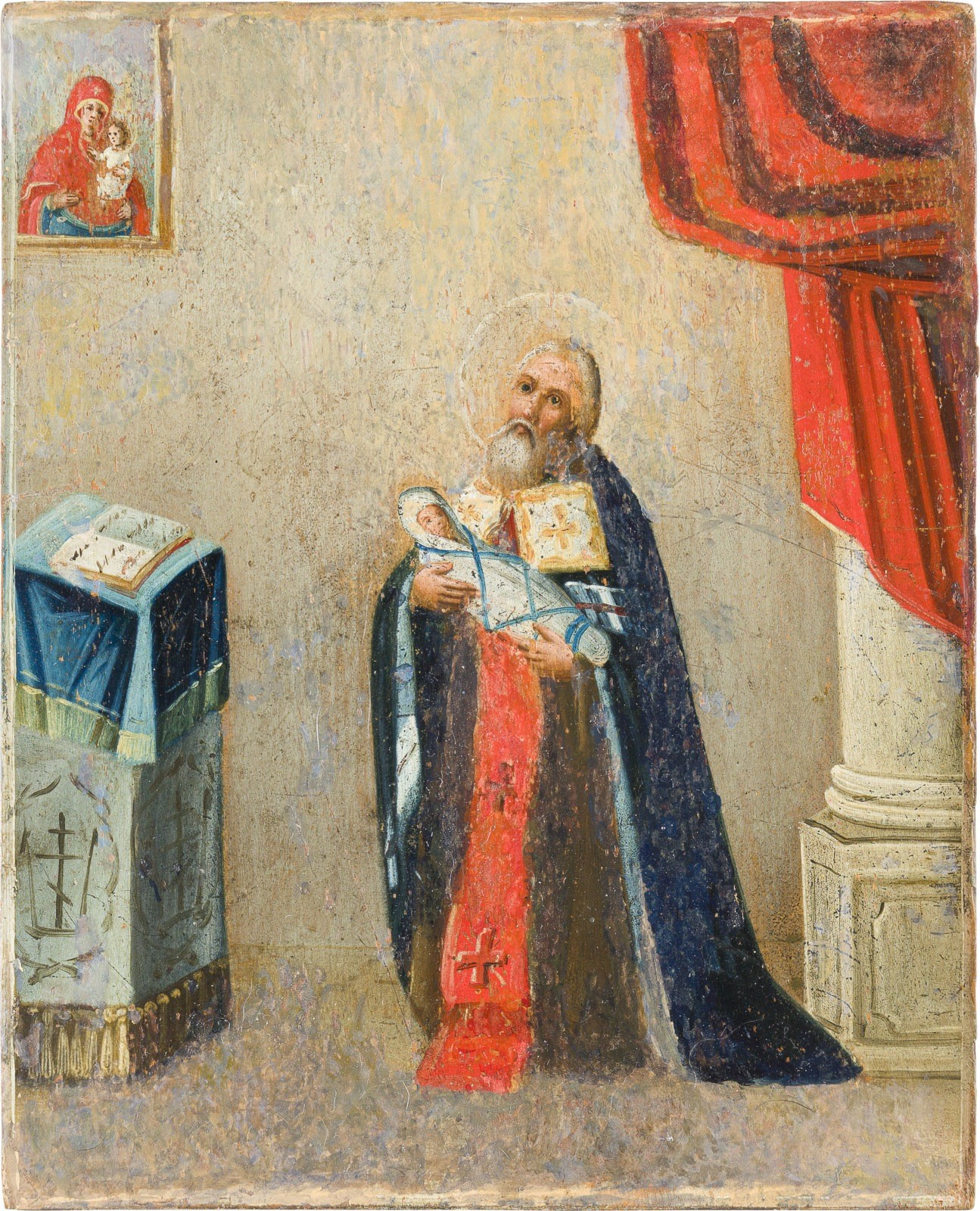 TWO ICONS SHOWING THE DEISIS AND ST. STYLIANOS Ukraine, 19th century Oil on wood panels. Restorations. 17.8 x 14.2 cm / 30.6 x 23.1 cm.