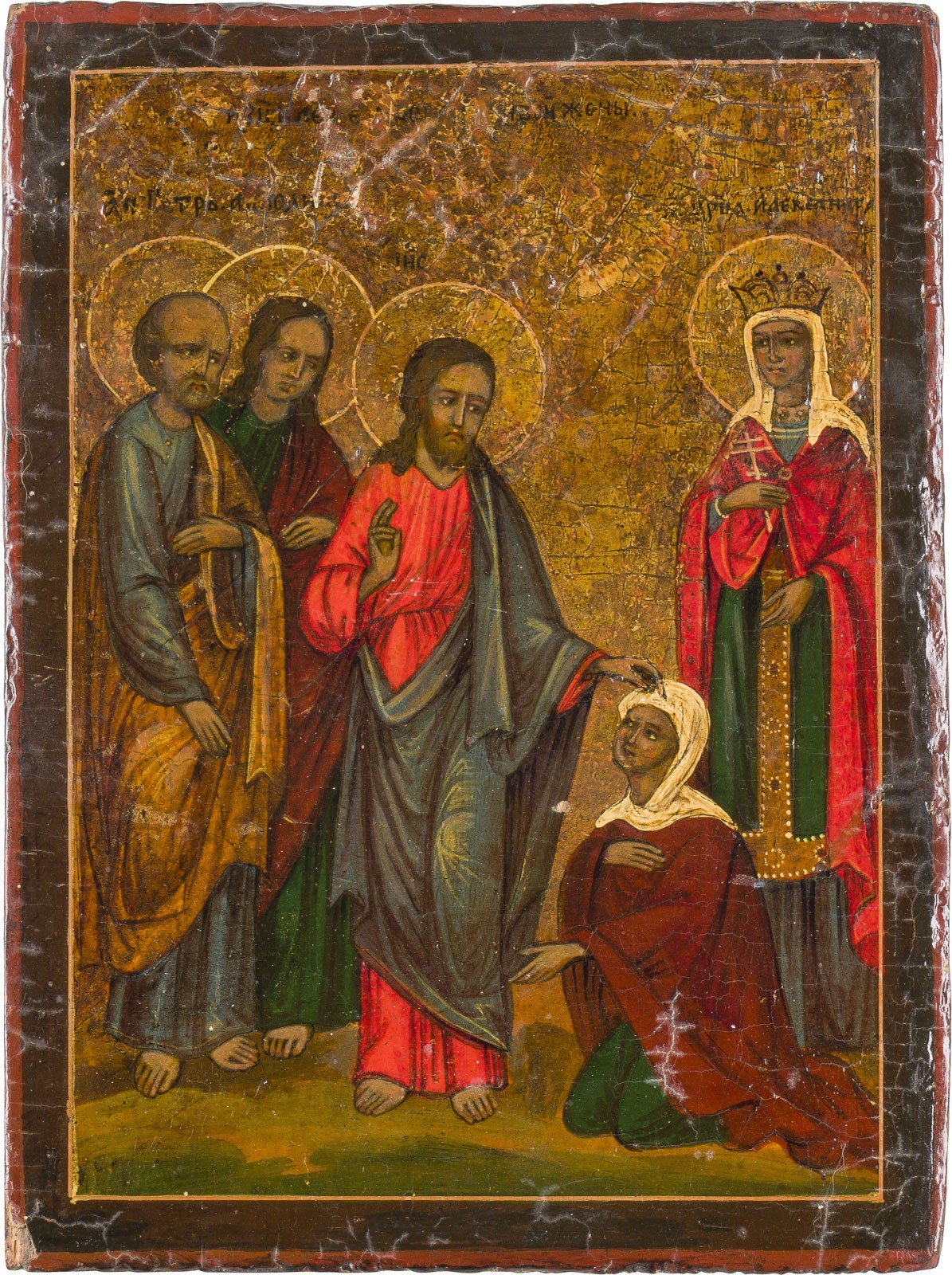 TWO ICONS: CHRIST HEALING THE BLEEDING WOMAN AND THE BAPTISM OF CHRIST Russian / Bulgarien, 19th century Tempera / oil on wood panels. Wearings, minimally restored. 23.5 x 17.7 cm / 34 x 25.3 cm.