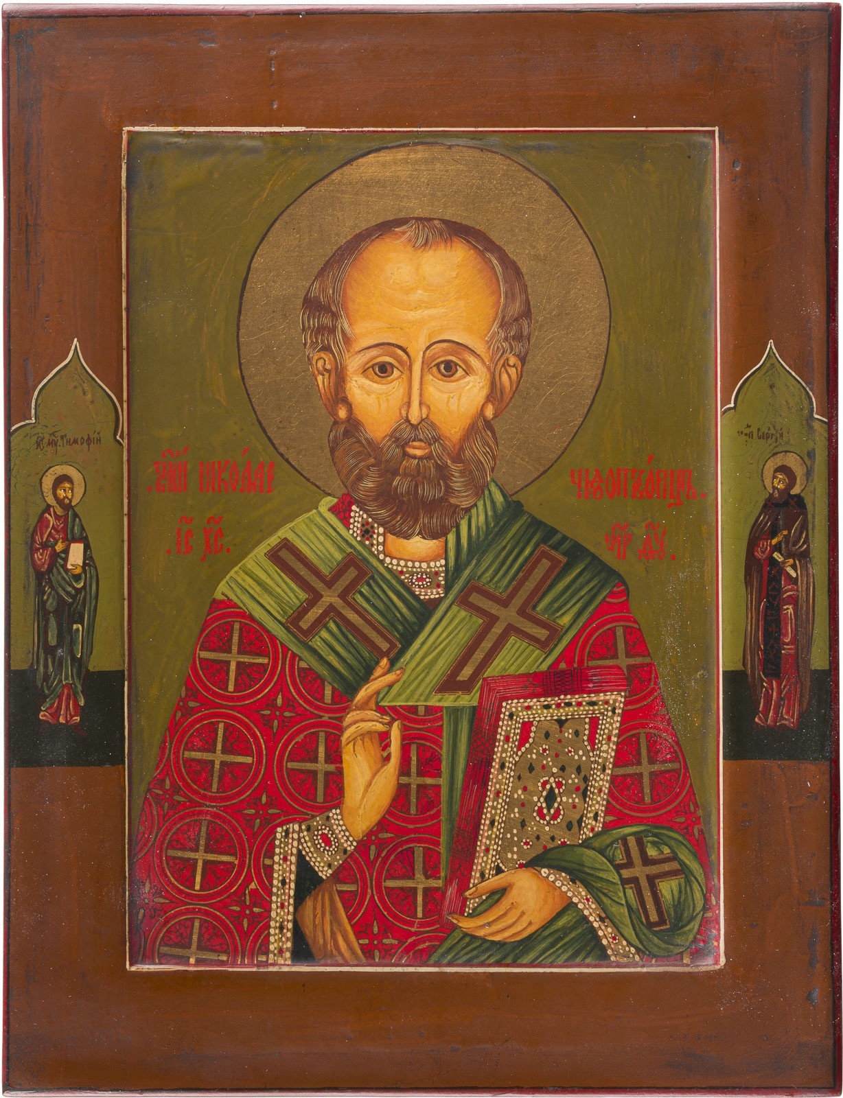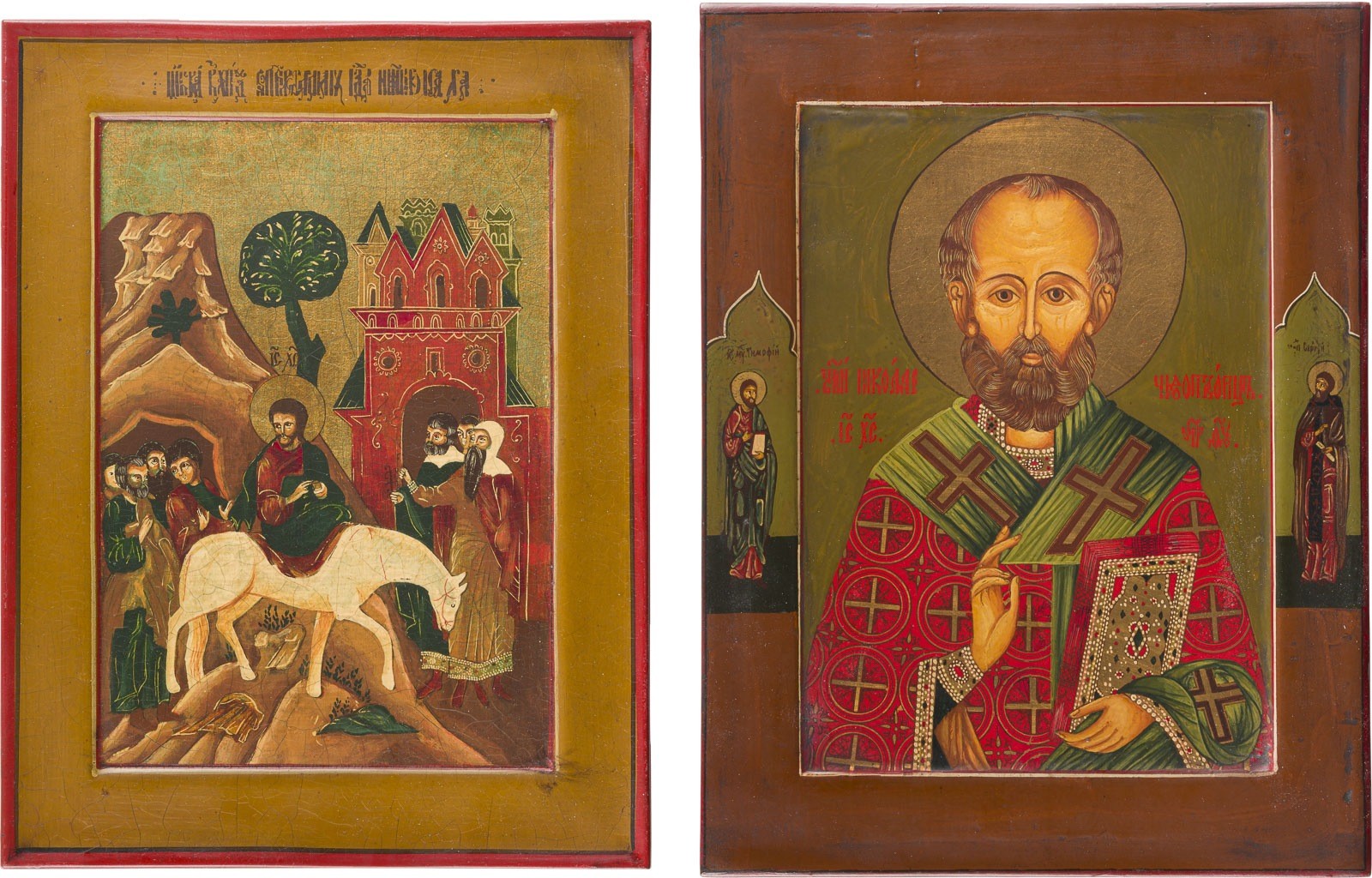 TWO ICONS SHOWING THE ENTRY INTO JERUSALEM AND ST. NICHOLAS OF MYRA Recent Tempera on wood panels with double kovcheg. The haloes made of gold. 31 x 23.8 cm / 30 x 22.8 cm.