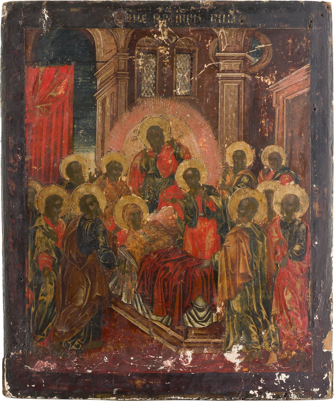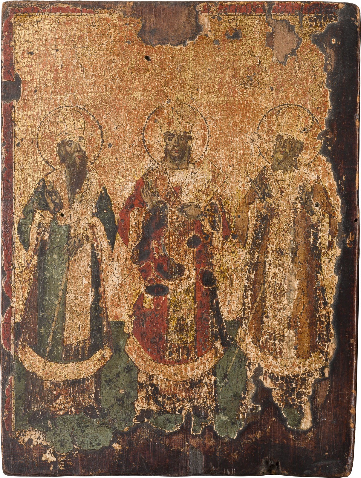 TWO ICONS: THE DORMITION OF THE MOTHER OF GOD AND THREE HIERARCHS OF ORTHODOXY Russian / Greek, 18th century Tempera on wood panel. The haloes and background made of gold. Losses, restored. 31.8 x 26.6 cm / 30.4 x 22.8 cm.