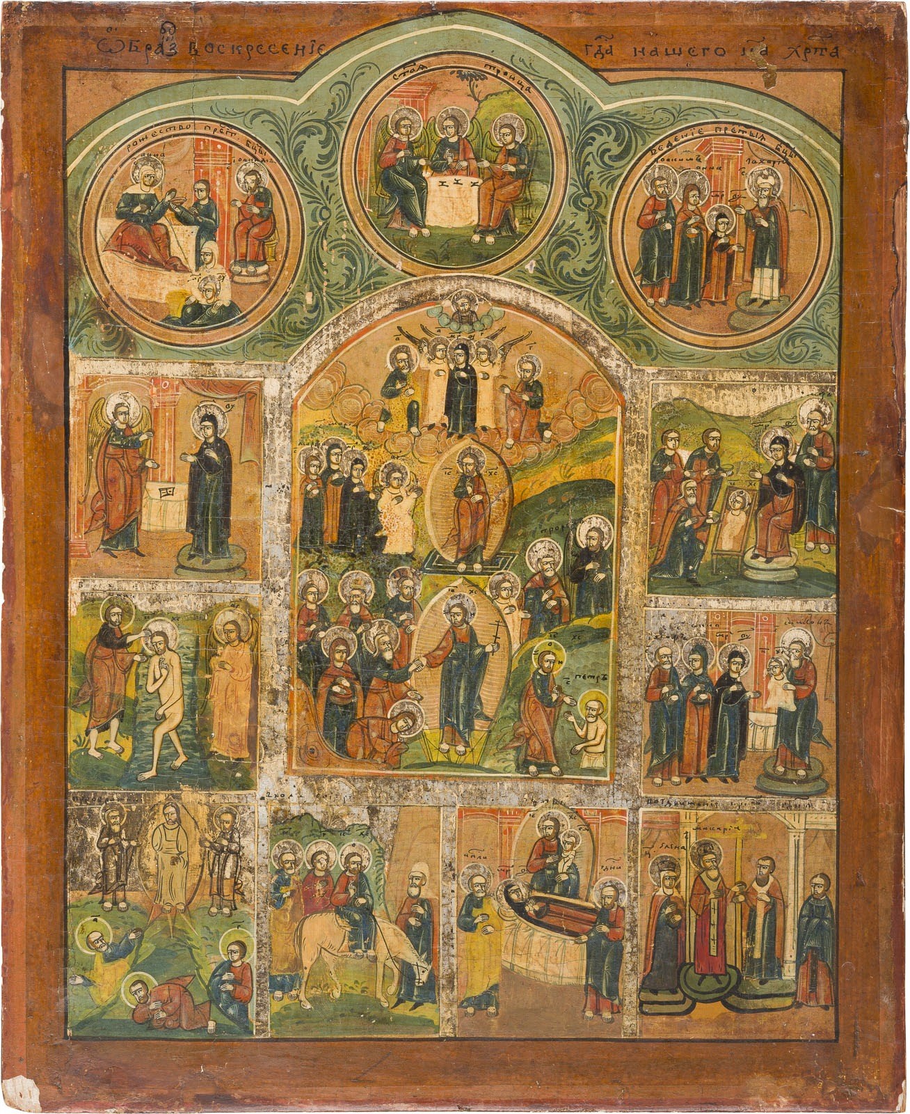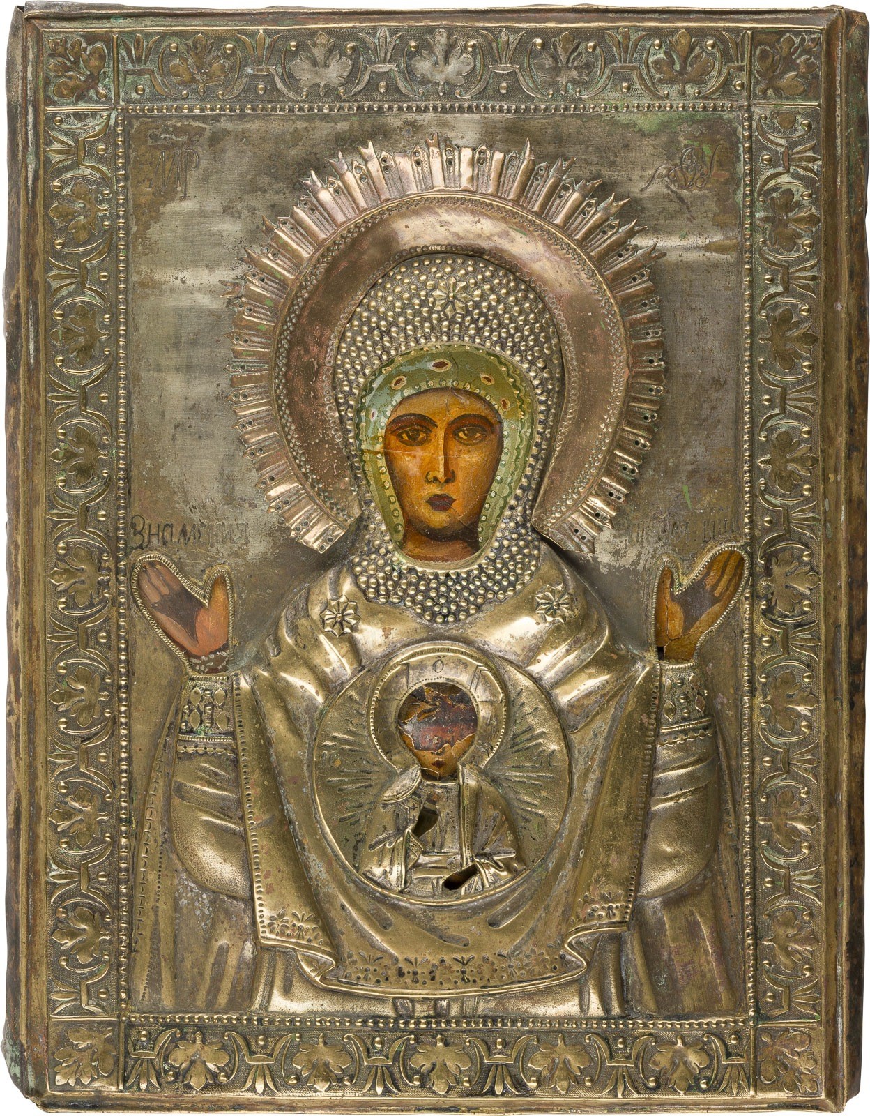 TWO ICONS: A FEAST DAY ICON AND THE MOTHER OF GOD OF THE SIGN WITH OKLAD Russian, 19th/20th century Tempera / oil on wood panels. The brass oklad chased and repoussé. Paint blisterings, losses, one icon painted in recent decades. 48.3 x 39.1 cm / 32.7 x 25.8 cm.