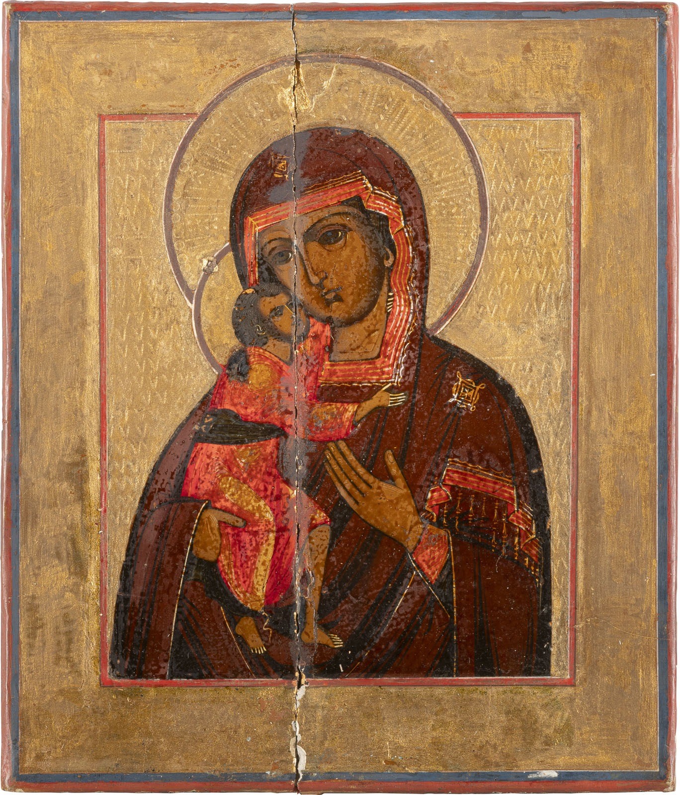 TWO ICONS SHOWING THE FEODOROVSKAYA MOTHER OF GOD AND ST. HARALAMPOS Russian, 19th century Tempera on wood panels. The background made of silver and gold. One icon with four selected saints on the borders. Losses, vertical crack, restored. 31.1 x 26.3 cm / 29.3 x 20.5 cm.