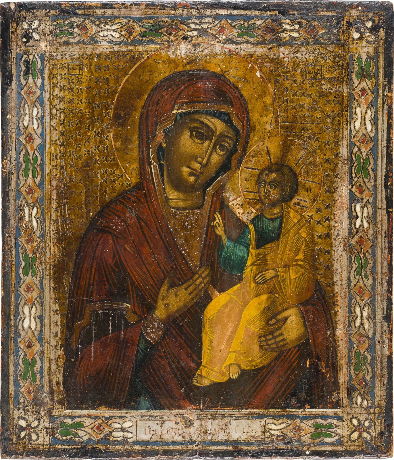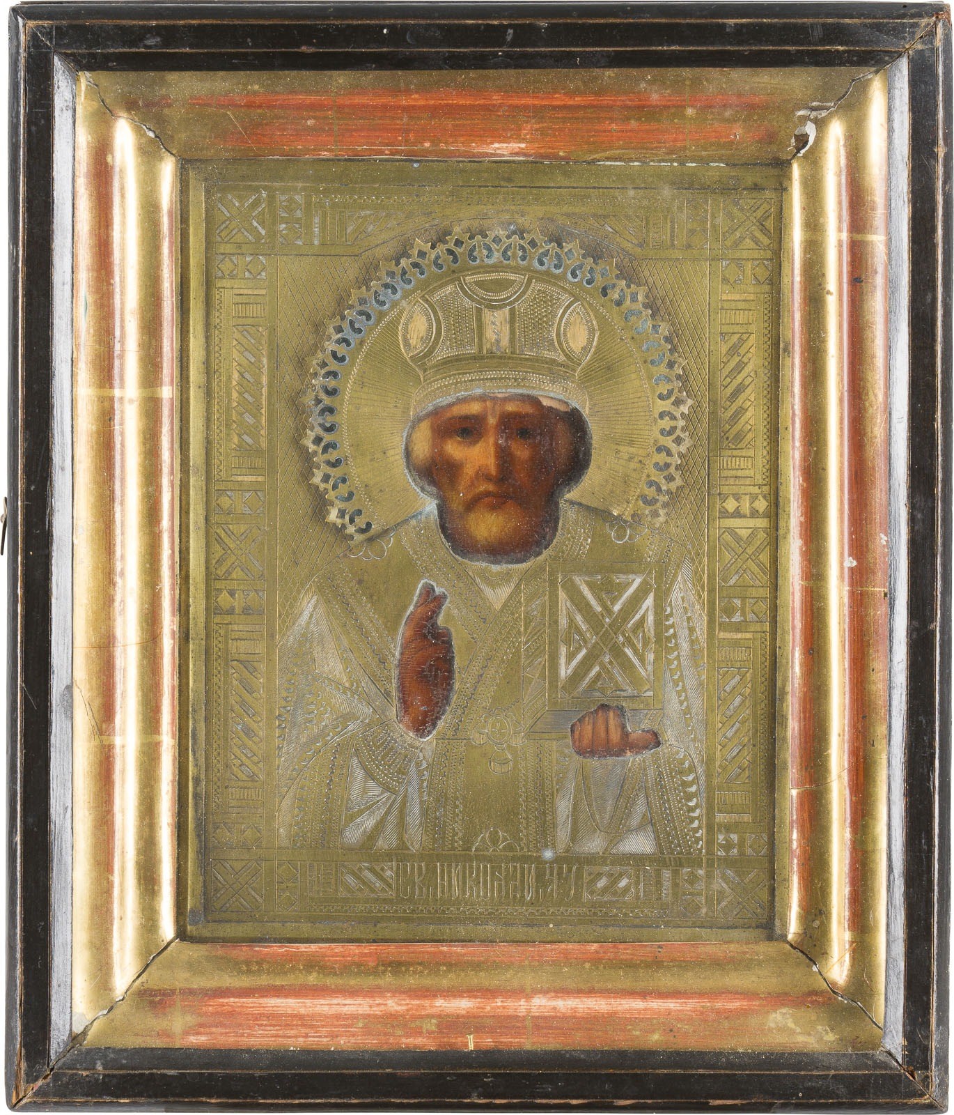TWO ICONS: THE IVERSKAYA MOTHER OF GOD, AND SAINT NICHOLAS OF MYRA WITH OKLAD IN A KIOT Russian, late 19th century Tempera and oil on wood panels, with silvered background glazed in gold and ornamental engraving, both with brass oklads; one preserved in a glazed kiot. Some rubbing. 30.5 x 26.2 cm / 29 x 25 cm (including kiot).