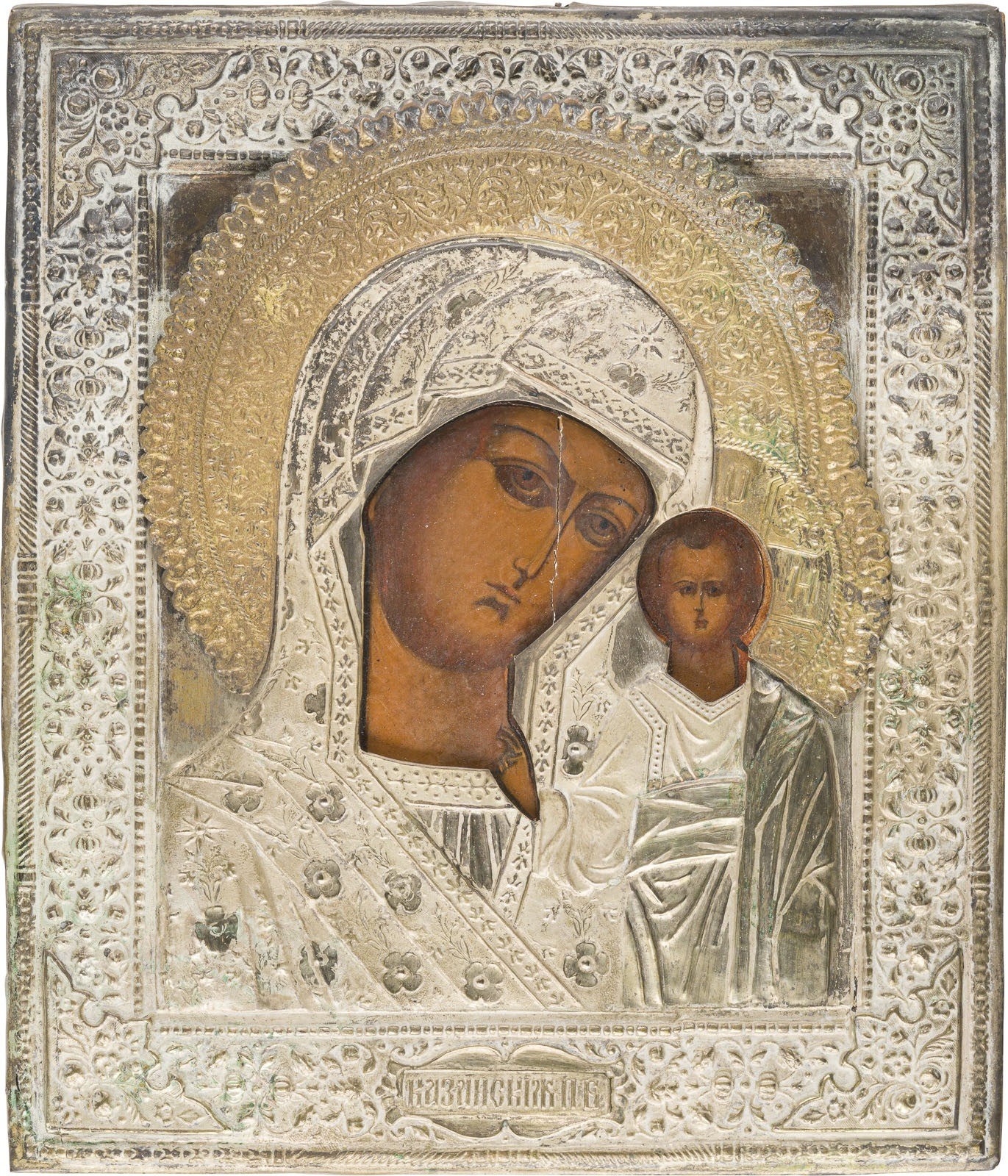 TWO ICONS SHOWING THE KAZANSKAYA MOTHER OF GOD WITH OKLAD AND THE THREE-HANDED MOTHER OF GOD Russian, 19th century Tempera on wood panels. The haloes made of silver, covered by a golden lacquer. The metal oklad chased with foliage. One icon with two selected saints on the borders. Restorations. 30.8 x 26.5 cm / 35.4 x 30.6 cm.