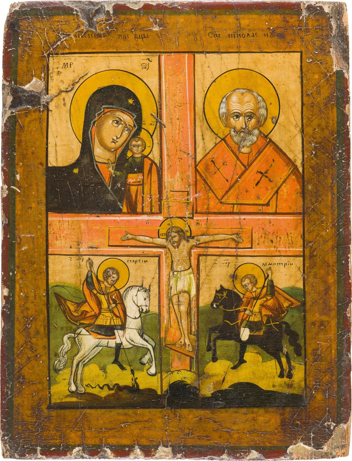 TWO ICONS SHOWING THE VLADIMIRSKAYA MOTHER OF GOD AND A QUADRI-PARTITE ICON Russian, 19th century Tempera on wood panels. The background made of silver, the haloes and garments ornately punched. Losses. 31.3 x 24.1 cm / 27.8 x 21.8 cm.