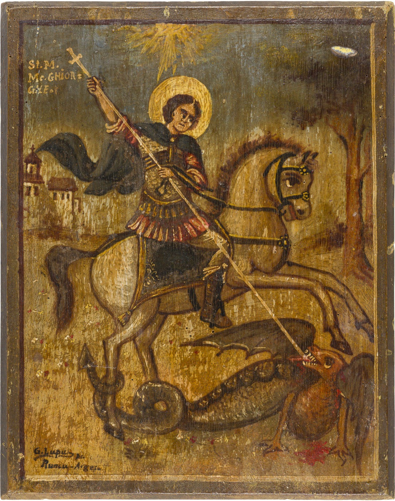 TWO ICONS SHWOING STS. DEMETRIUS AND GEORGE SLAYING THE DRAGON Romanian, 19th century Oil on wood panels. One icon signed 'G. Lupu pc. Runcu-Arges'. Losses, damages. 32.5 x 24.2 / 40.8 x 32.5 cm.