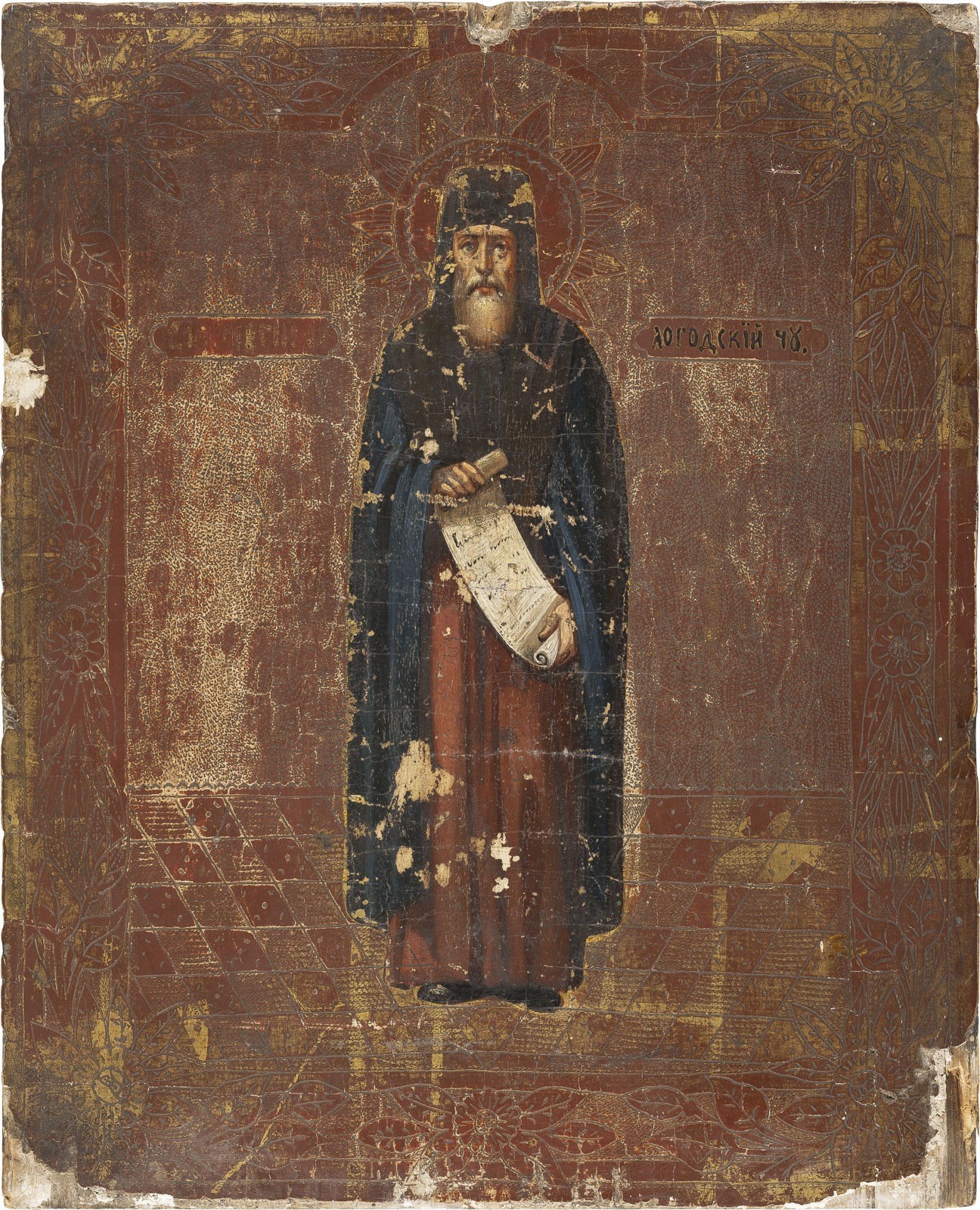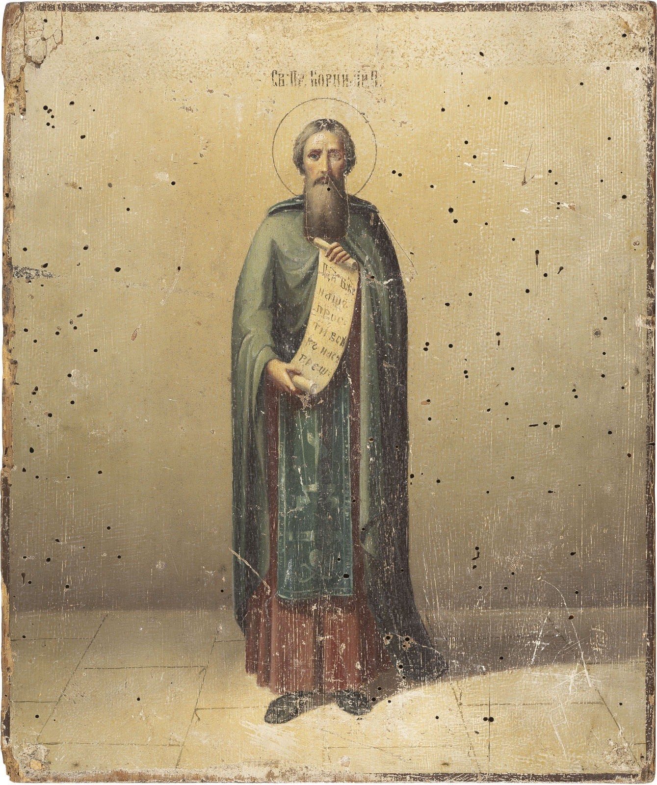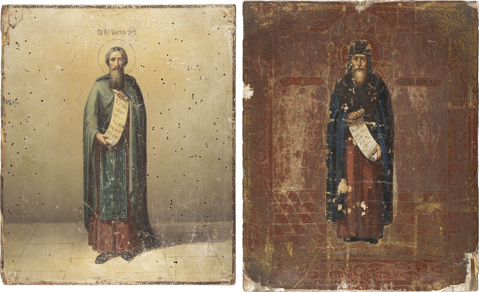 TWO ICONS SHOWING SAINT GEORGIY OF VOLOGDA AND SAINT CORNELIUS OF KOMEL Russian, 2nd half of the 19th century Oil on wood panels, partial gilding, ornamental punching and engraving. Paint losses, damaged. 32 x 26.4 cm / 30.8 x 26 cm.