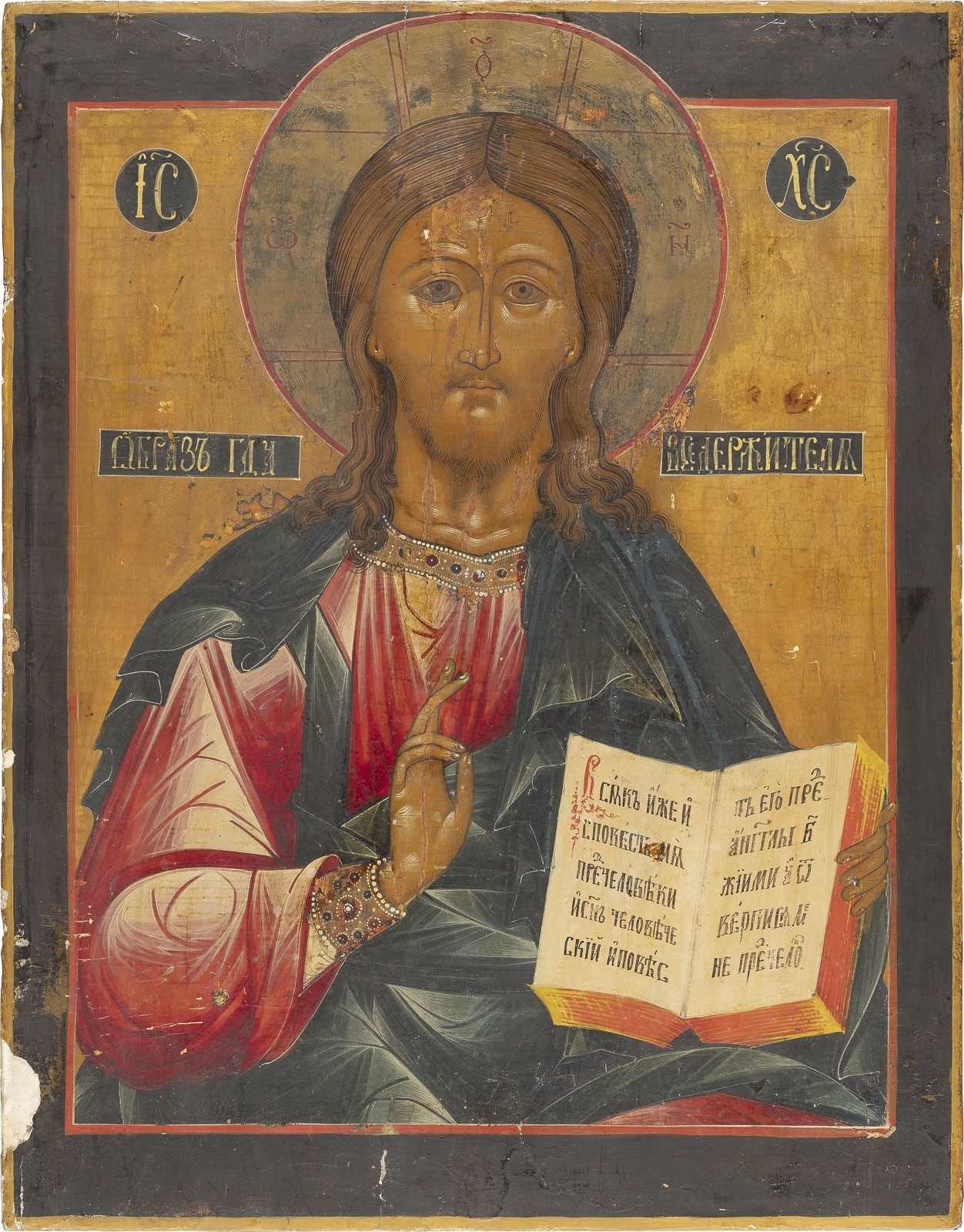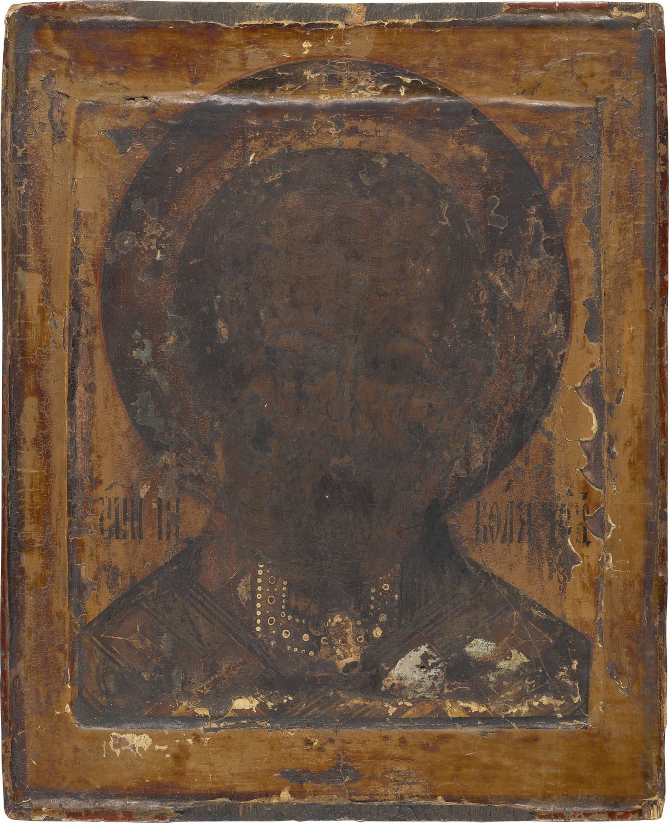 TWO ICONS SHOWING ST. NICHOLAS OF MYRA AND CHRIST PANTOKRATOR Russian, 17th/19th century Tempera on wood panels, the halo made of gold. Losses, restored. 31.5 x 26 cm / 44.8 x 35 cm.