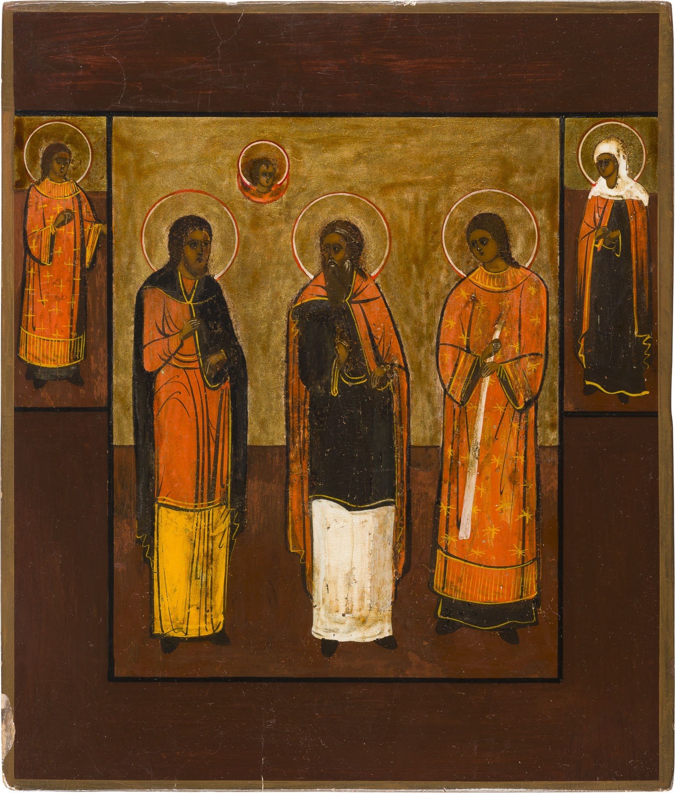 TWO ICONS SHOWING ST. NICHOLAS OF MYRA AND STS. SAMON, GURIY AND AVIV Russian, 19th century Tempera on wood panels. The background made of silver, covered by a golden lacquer. Partially restored, one icon with evidence of woodworm. 33.7 x 28.6 cm / 30.2 x 25.5 cm.