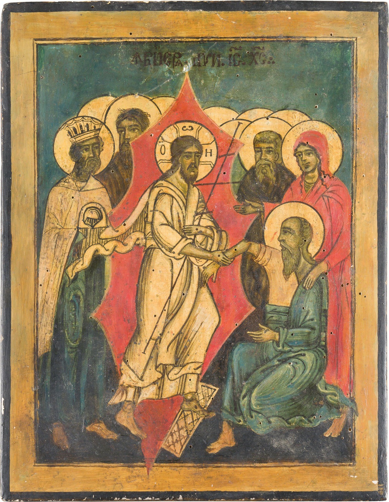 TWO ICONS: THE DESCENT INTO HELL AND THE HARROWING OF HELL, AND THE MOTHER OF GOD 'JOY TO ALL WHO GRIEVE' Balkans / Russia, 18th / 19th century Tempera on wood panels. Some losses, partly rubbed. 30.8 x 24 cm / 31.1 x 25.8 cm.