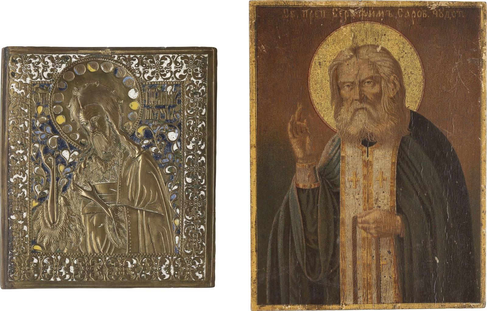 TWO ICONS DEPICTING ST. JOHN THE FORERUNNER FROM A DEISIS AND ST. SERAPHIM OF SAROV Russian, 19th/20th century Brass, cast in relief, four-colour enamelled/lithograph on wood panel. Enamel part. chipped, lithograph min. rubbed. 16.1/20.2 cm high.