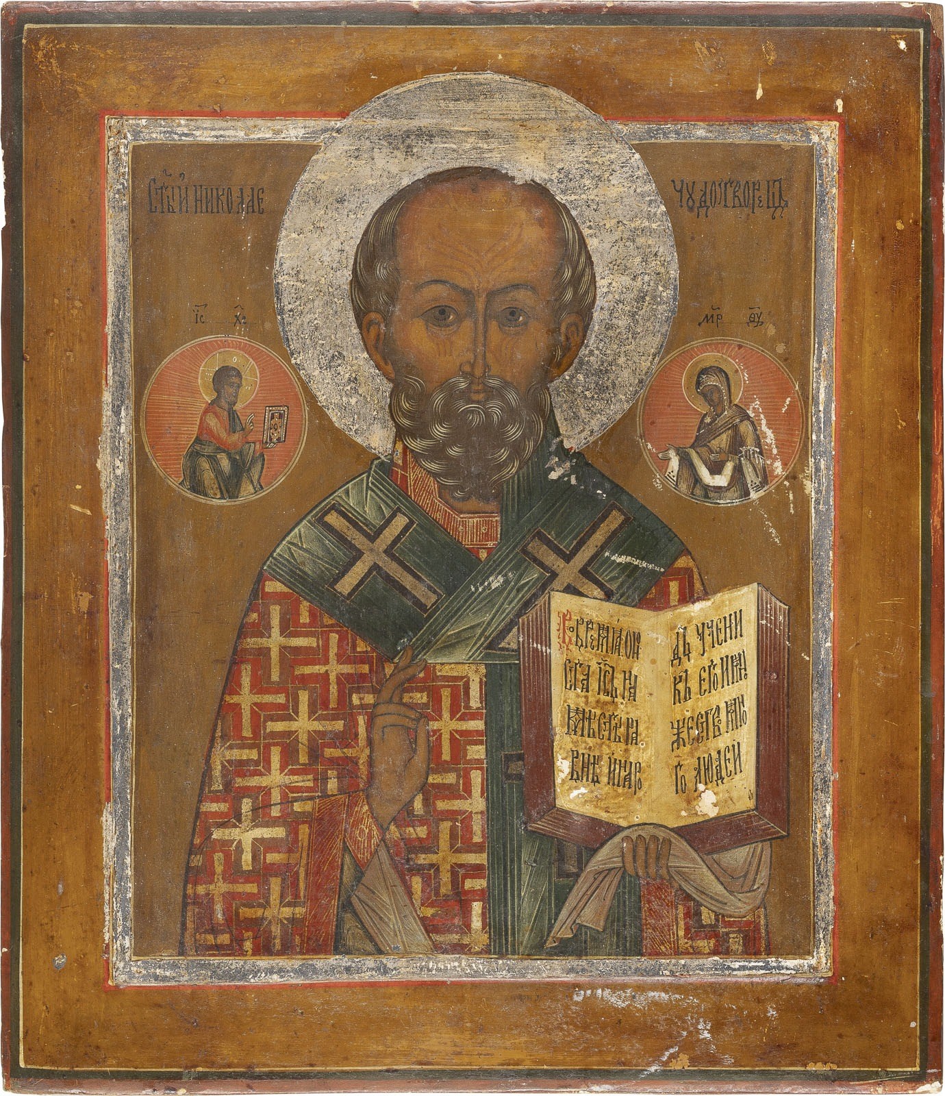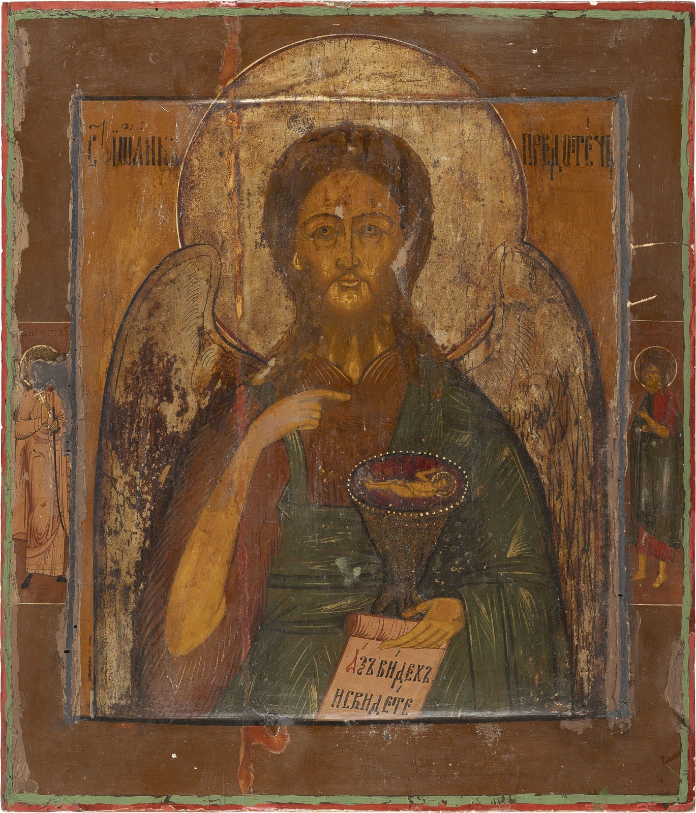 TWO ICONS SHOWING ST. JOHN THE FORERUNNER AND ST. NICHOLAS OF MYRA Russian, 19th century Tempera on wood panels with kovcheg. The haloes made of silver, covered by a golden lacquer. Vertical crack, damages, losses, restored. 35 x 30.3 cm / 35.2 x 30.6 cm.
