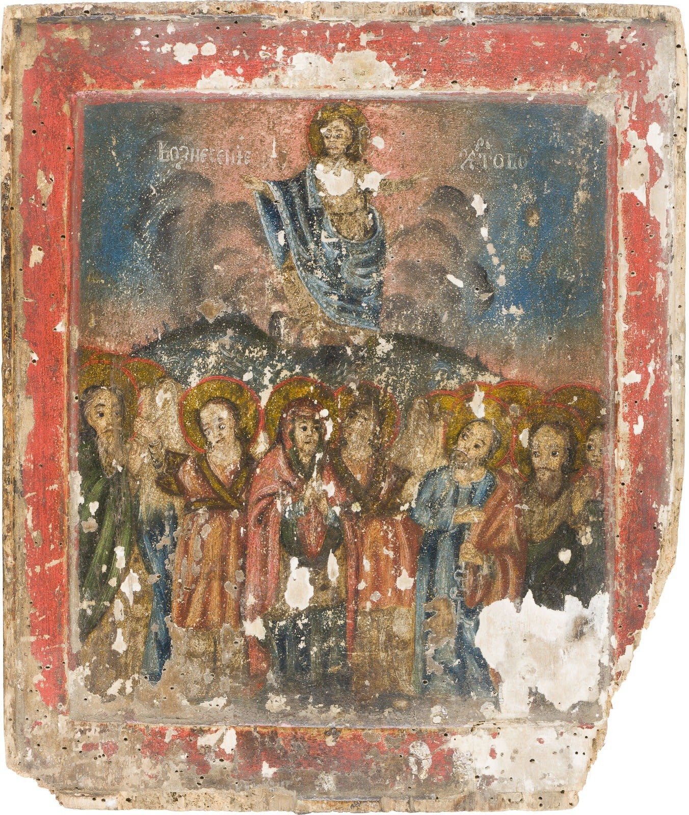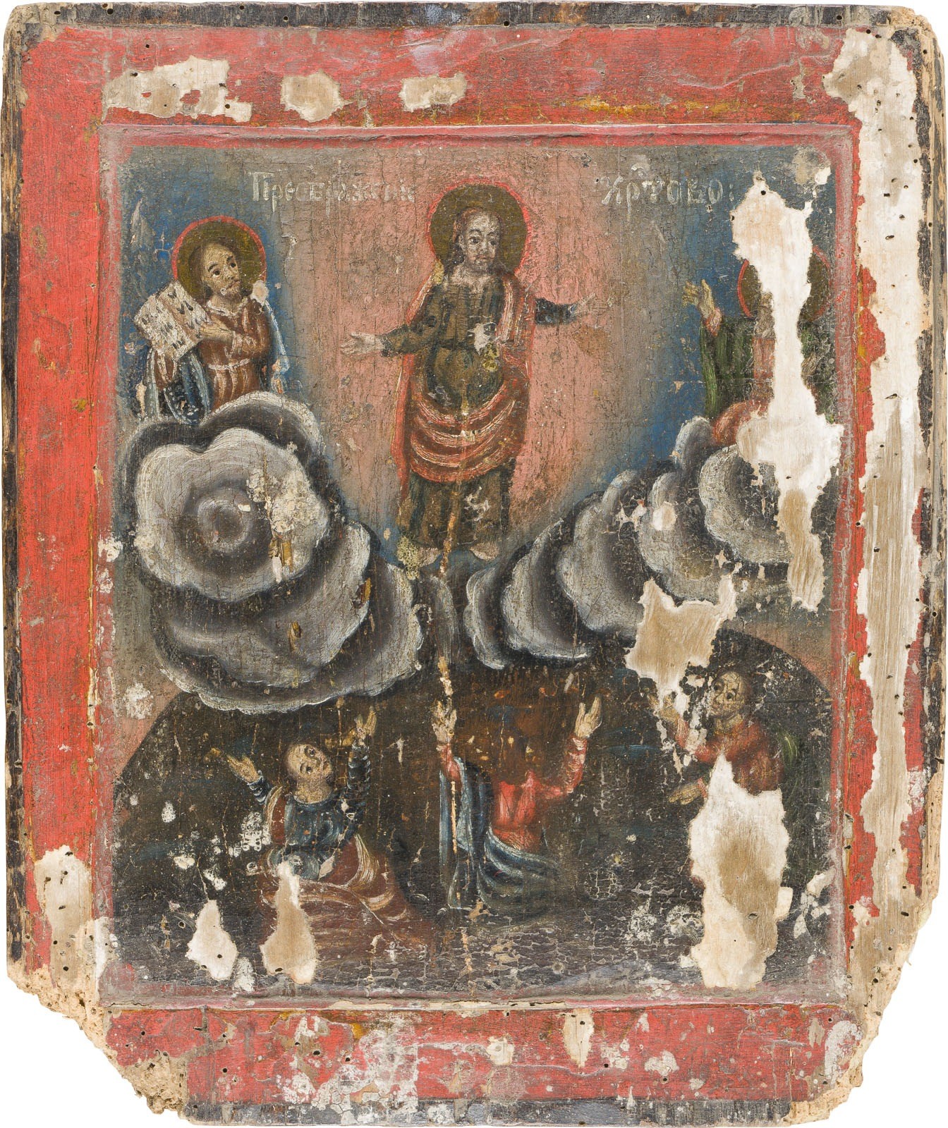 TWO ICONS: THE TRANSFIGURATION AND THE ASCENSION OF CHRIST Romanian, 18th century Oil on wood panels with kovcheg. Losses, evidence of old woodworm. 31.5 x 25.8 cm.
