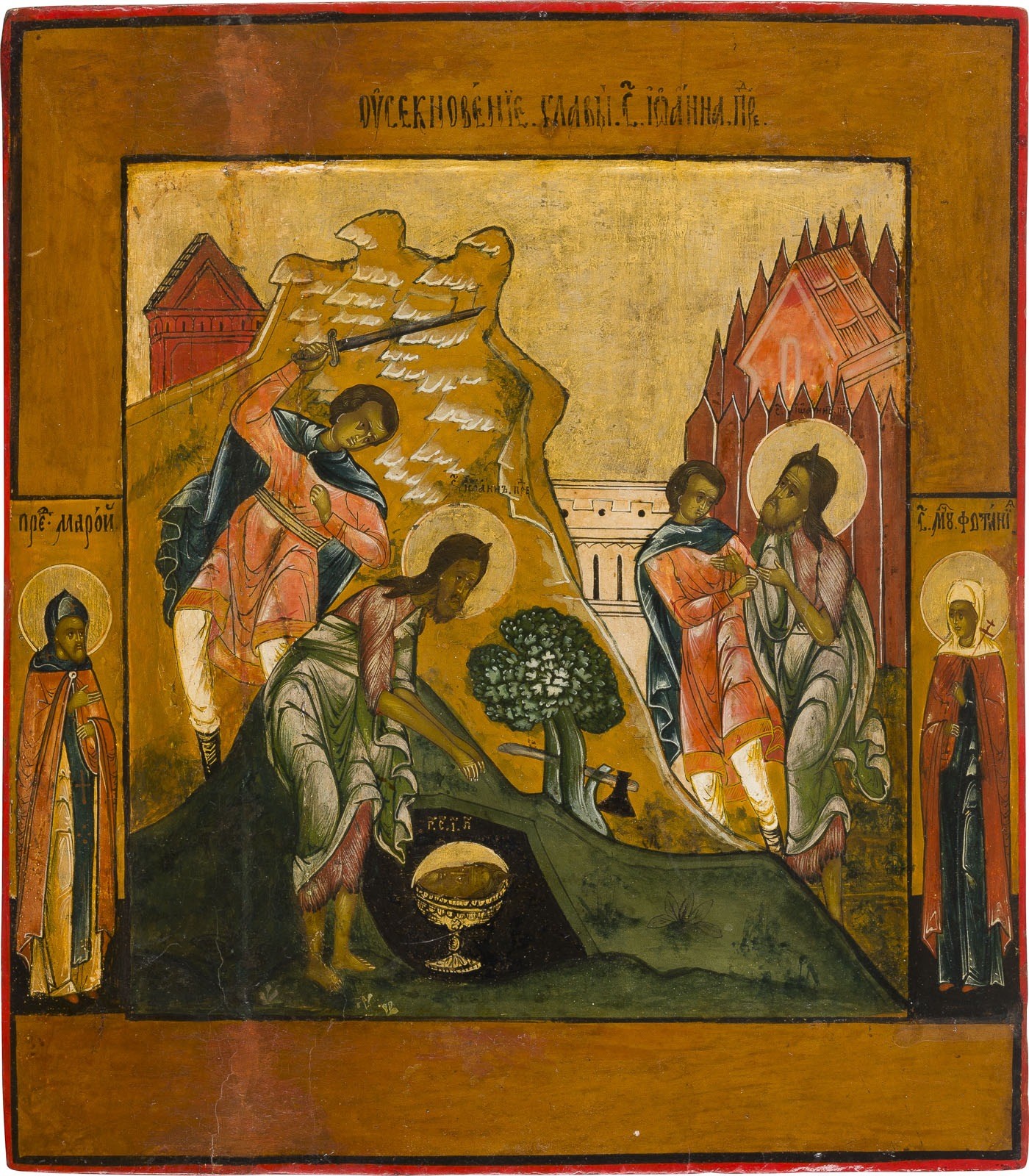 TWO ICONS SHOWING THE PROPHET ELIJAH AND HIS FIERY ASCENT TO HEAVEN AND THE BEHEADING OF ST. JOHN THE FORERUNNER Russian, 18th/19th century Tempera on wood panels with kovcheg. The haloes made of gold. One icon with two selected saints on the borders: Sts. Maron and Photine. Wearings, areas of restoration. 31 x 26.2 cm / 30.4 x 27.3 cm.