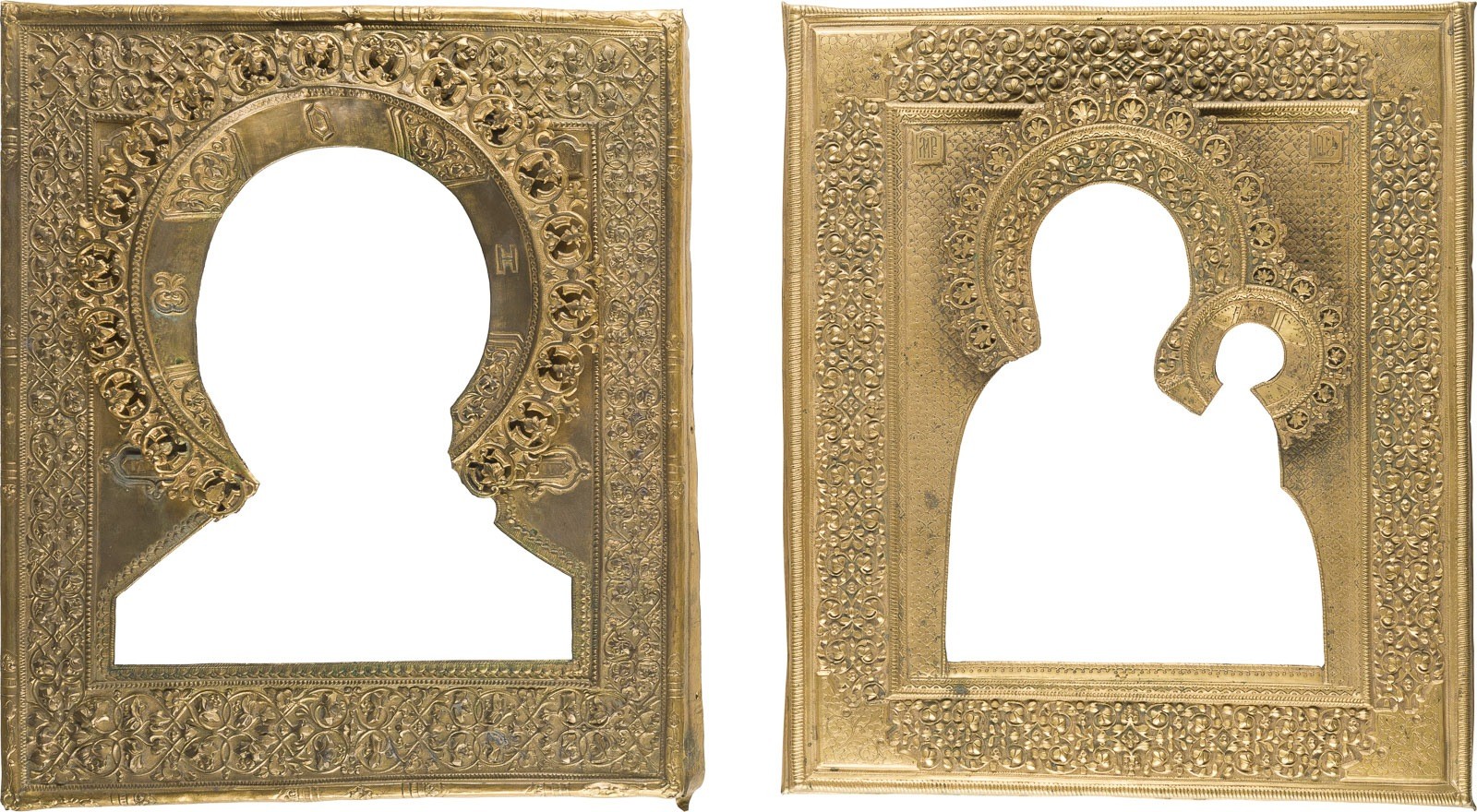 TWO BRASS RIZAS FOR ICONS SHOWING CHRIST AND THE MOTHER OF GOD Russian, 19th century Chased and repoussé. 31.3 x 26.8 cm / 31.3 x 26.5 cm.