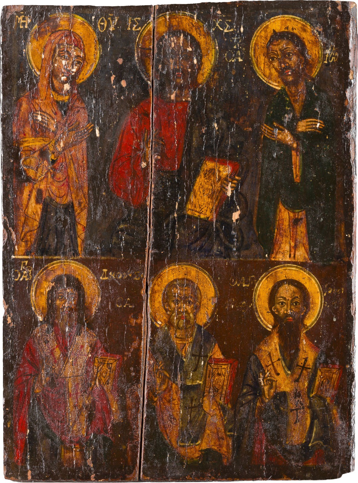 TWO ICONS: A TWO-PARTITE ICON SHOWING THE DEISIS AND SAINTS AND ST. STYLIANOS Greek, 19th century Oil on wood panels. The background made of gold. Losses, vertical cracks. 32.3 x 23.5 cm / 30.6 x 21.5 cm.