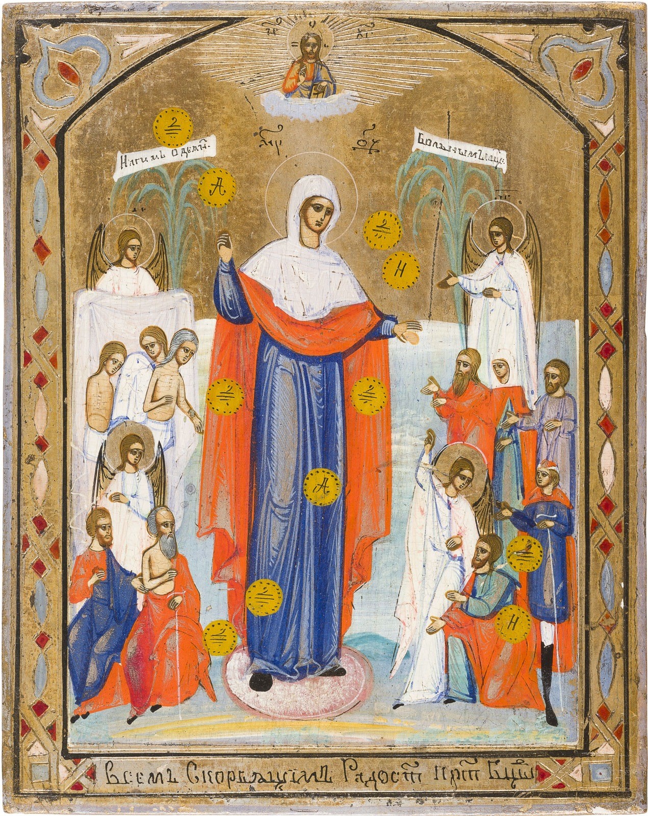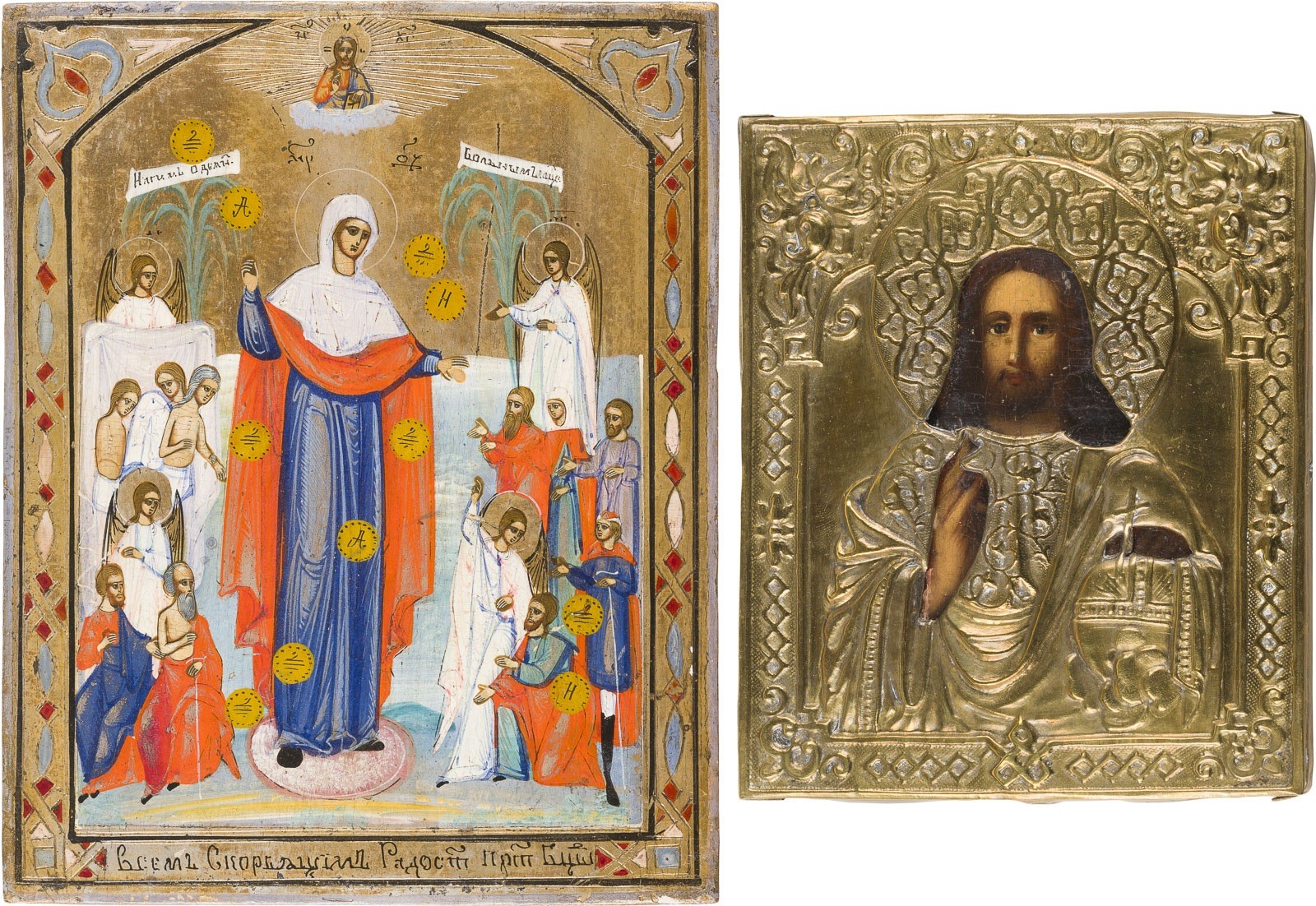 TWO SMALL ICONS SHOWING CHRIST PANTOKRATOR WITH OKLAD AND THE MOTHER OF GOD 'JOY TO ALL WHO GRIEVE' WITH COINS Russian, 2nd half of the 19th century Tempera / oil on wood panels. The background made of silver, covered by a golden lacquer. The brass oklad chased with scrolls. 13.2 x 11 cm / 17.5 x 14.1 cm.
