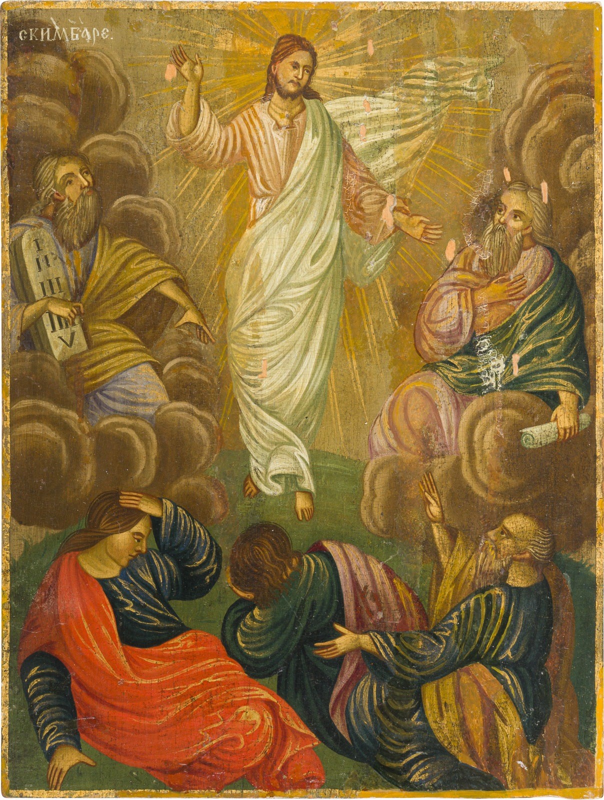 TWO SMALL ICONS: THE MOTHER OF GOD HODEGETRIA WITH OKLAD, AND THE TRANSFIGURATION OF CHRIST Romania / Balkans, 19th century Oil on wood panels, the first with a metal oklad. Minor restoration. 22.2 x 20.1 cm (including frame) / 25 x 18.8 cm.
