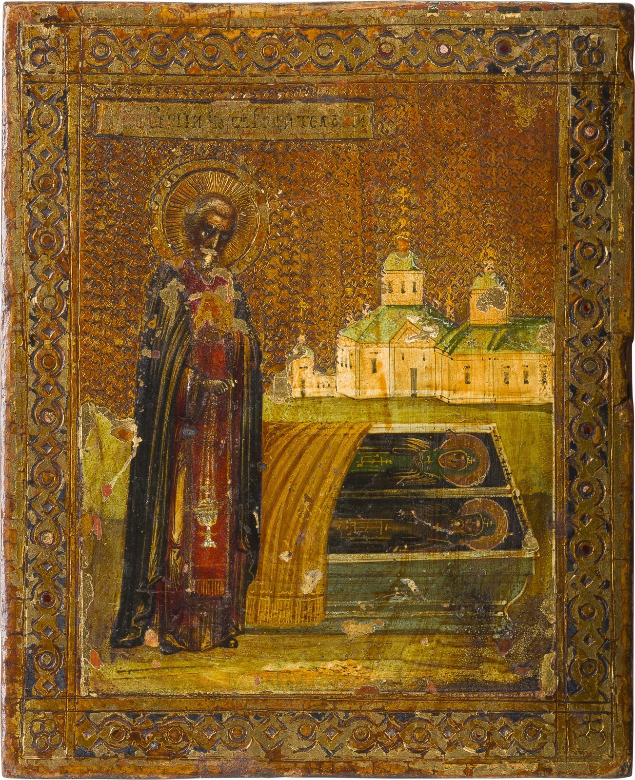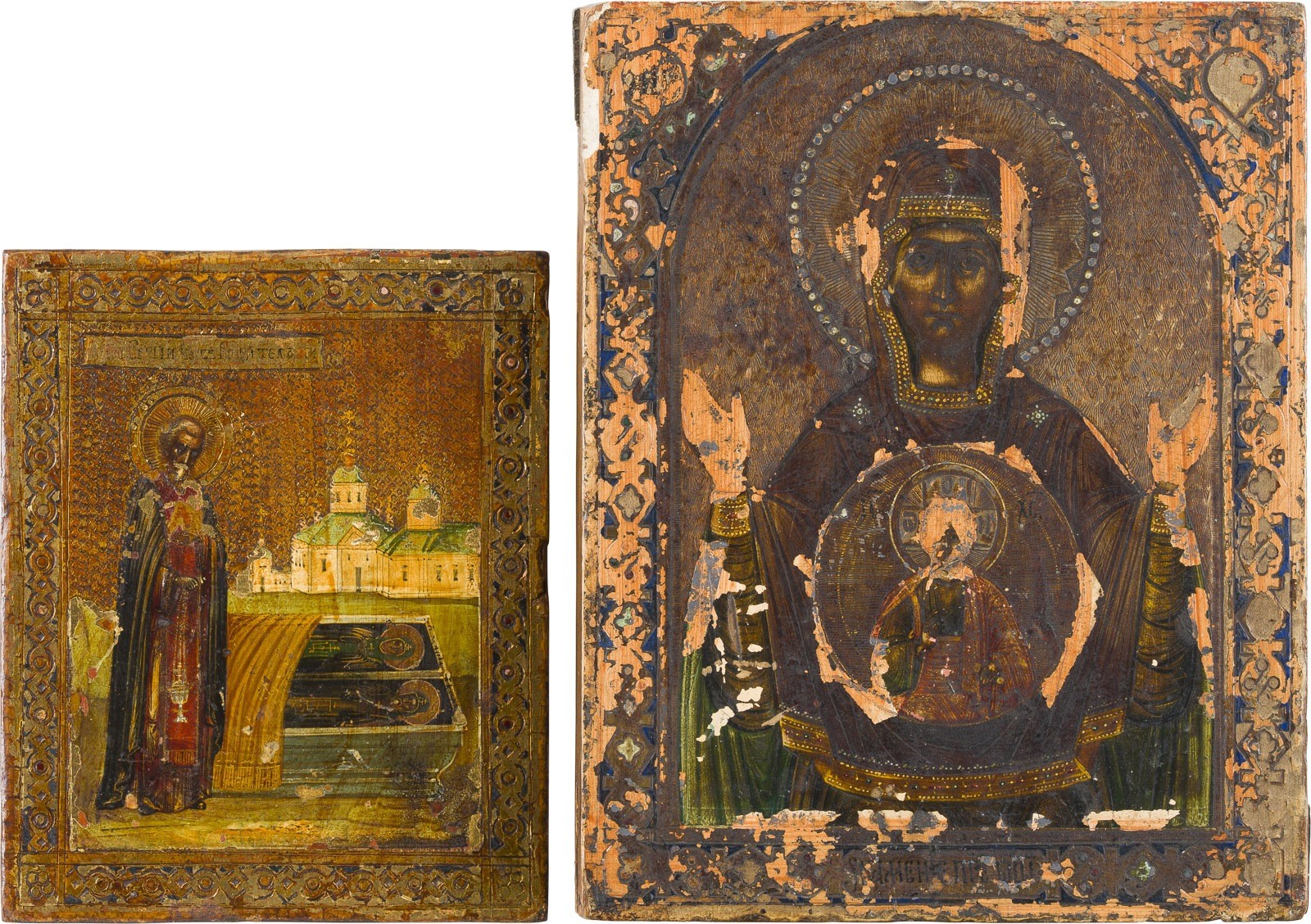 TWO SMALL ICONS SHOWING ST. SERGEY OF RADONEZH AND THE MOTHER OF GOD OF THE SIGN Russian, circa 1900 Tempera on wood panels. The background made of gold. The borders painted with ornate strapwork and faux cloisonné enameling. Losses. 13 x 10.7 cm / 17.6 x 14.1 cm.