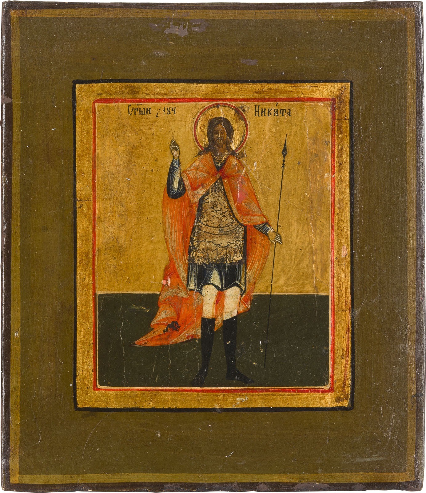 TWO SMALL ICONS WITH THE WARRIOR SAINT NIKITA AND THE MARRIAGE INTERCESSORS SAMON, GURIY AND AVIV Russian, 19th century Tempera on wood panels, partially silvered and glazed in gold. Minor retouching. 19.8 x 17.3 cm / 22.3 x 17 cm.