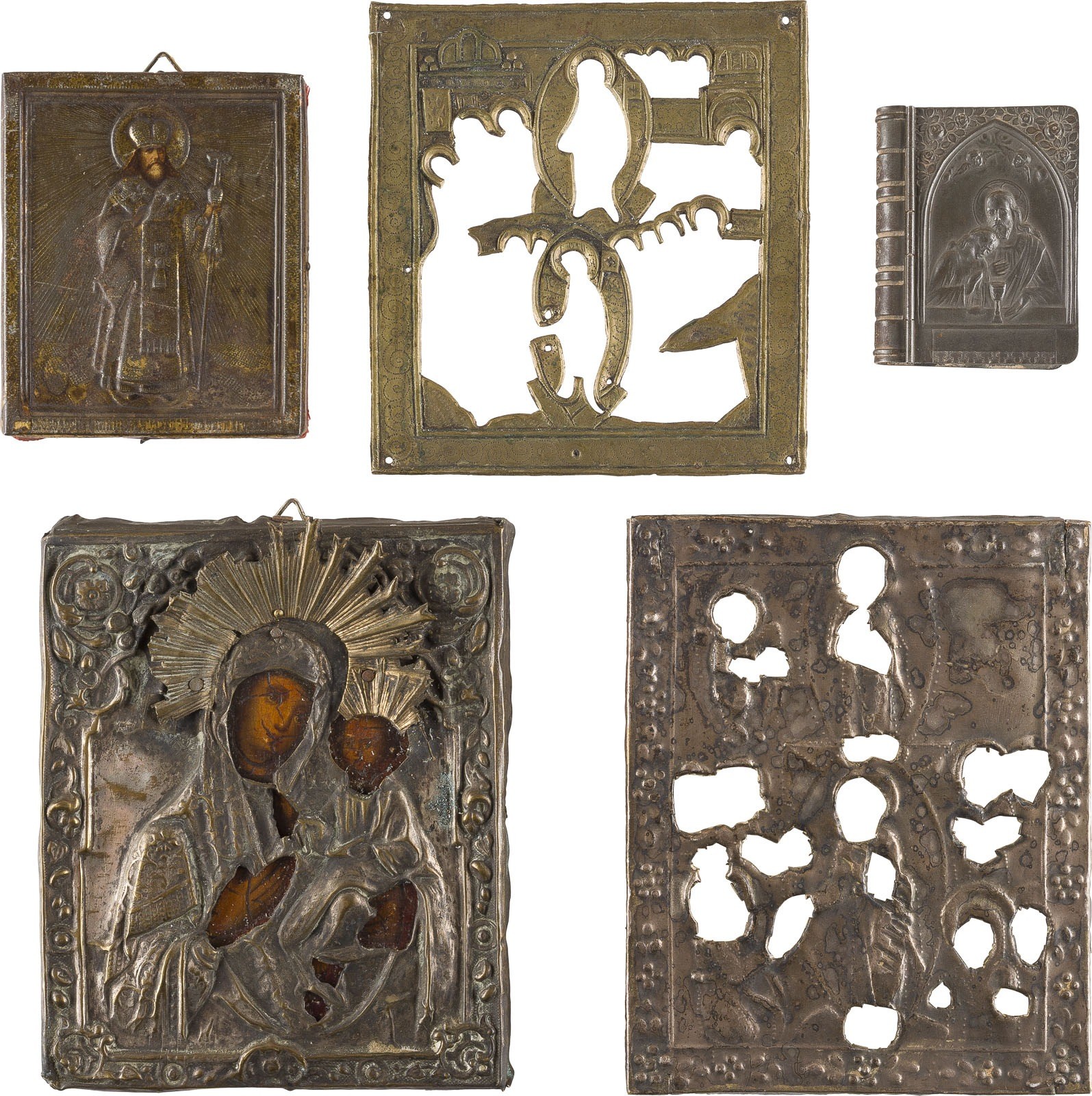 TWO SMALL ICONS DEPICTING THE MOTHER OF GOD OF IVERON AND SAINT FEODOSY OF UGLICH, TOGETHER WITH TWO OKLADS AND A PRAYER BOOK COVER Russian, 19th / early 20th century Wooden panels with oil painting / polychrome imprint on metal, metal oklads. One icon marked with Cyrillic maker's mark 'A. Smirnov' along the lower edge. Partly with wear and minor damages consistent with age. 6.1-13.3 cm.