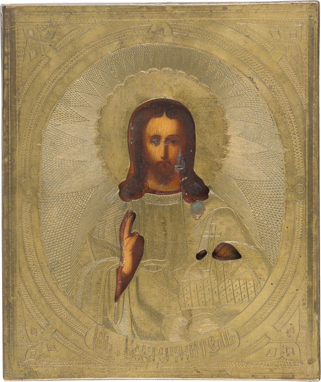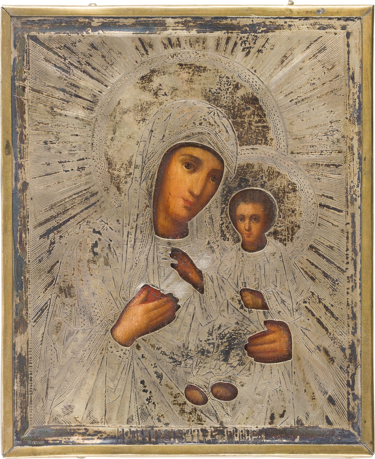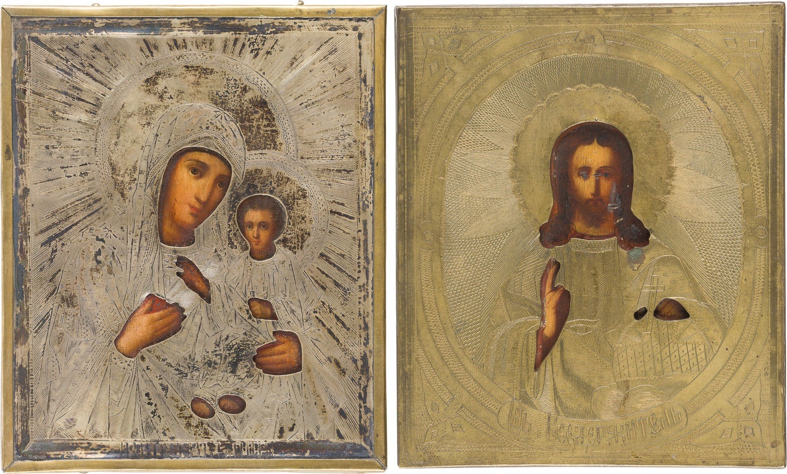 TWO SMALL ICONS WITH OKLAD SHOWING CHRIST PANTOKRATOR AND THE IVERSKAYA MOTHER OF GOD Russian, late 19th century Oil on wood panels. The brass and silver oklad with engraved decoration. The silber oklad marked. Partially restored. 13.3 x 11.2 cm / 13.3 x 11 cm.