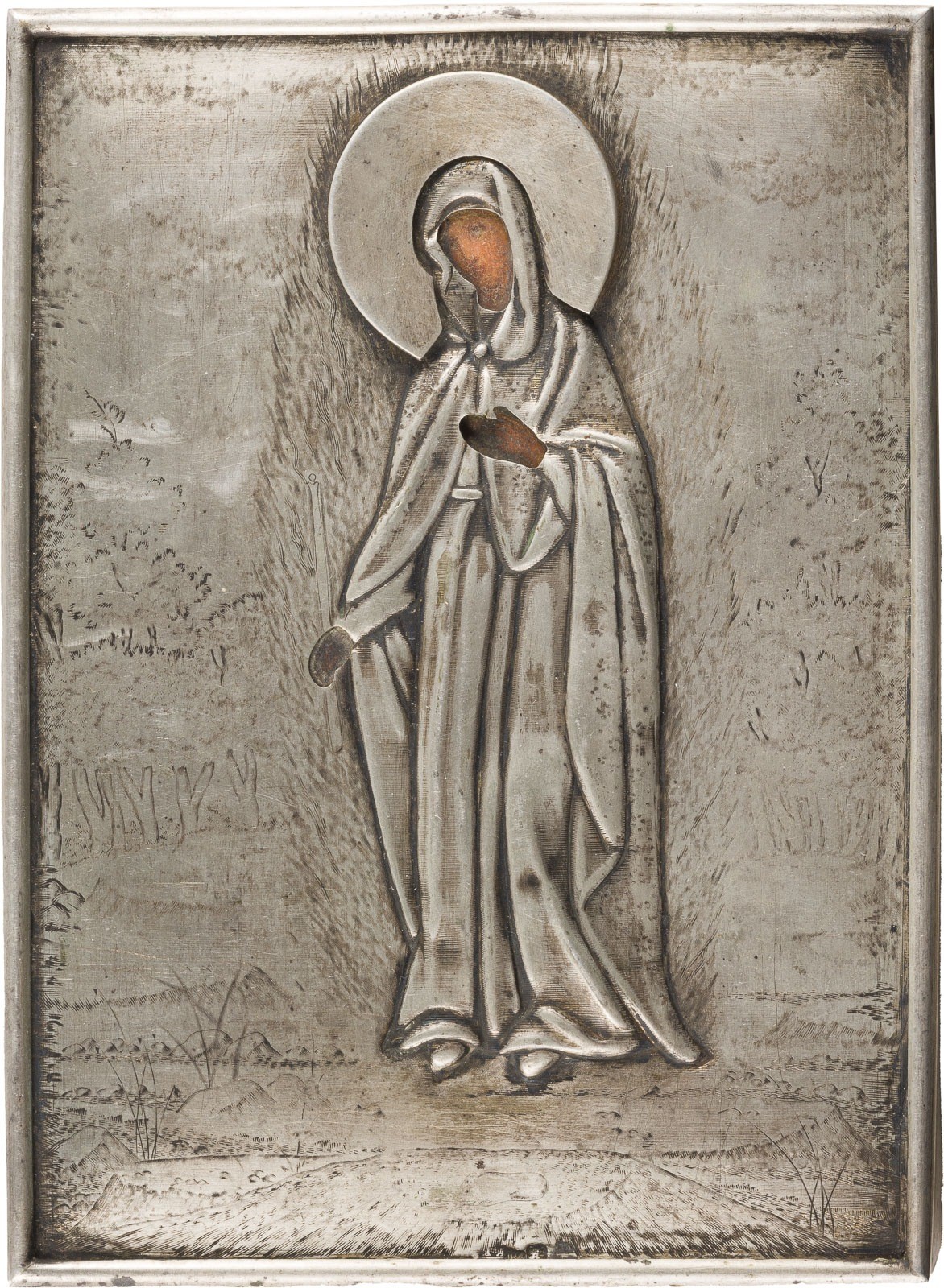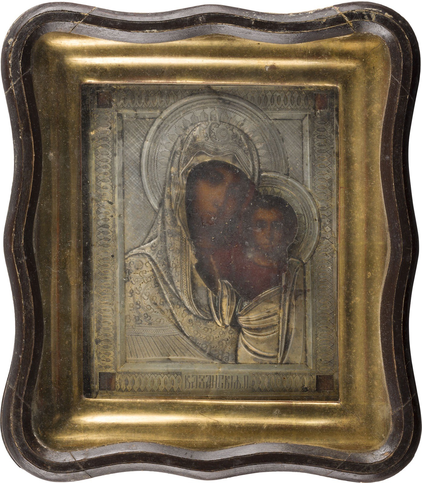 TWO SMALL ICONS WITH SILVER OKLAD: A RARE ICON OF THE MOTHER OF GOD 'THE BURNING BUSH' AND THE KAZANSKAYA MOTHER OF GOD Russian, circa 1900 / dated 1893 (icons), Russian, St. Petersburg, late 19th century / Moscow, 1896-1908 (oklads) Tempera / oil on wood panels. The silver oklads finely engraved. Fully marked with assayer's marks, city hallmark, 84 standard and master's marks. Partially damaged. One icon with a dedication inscription and the date '1893' on the reverse. 15.7 x 11.4 cm / 26 x 22.8 cm (including glazed kyot).