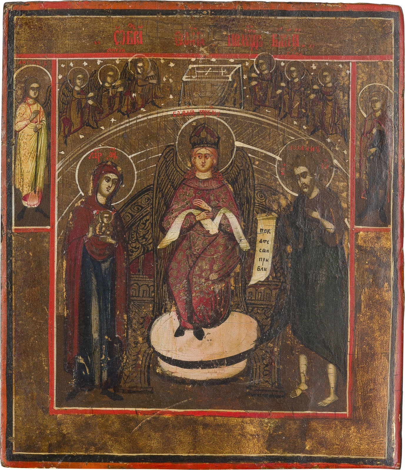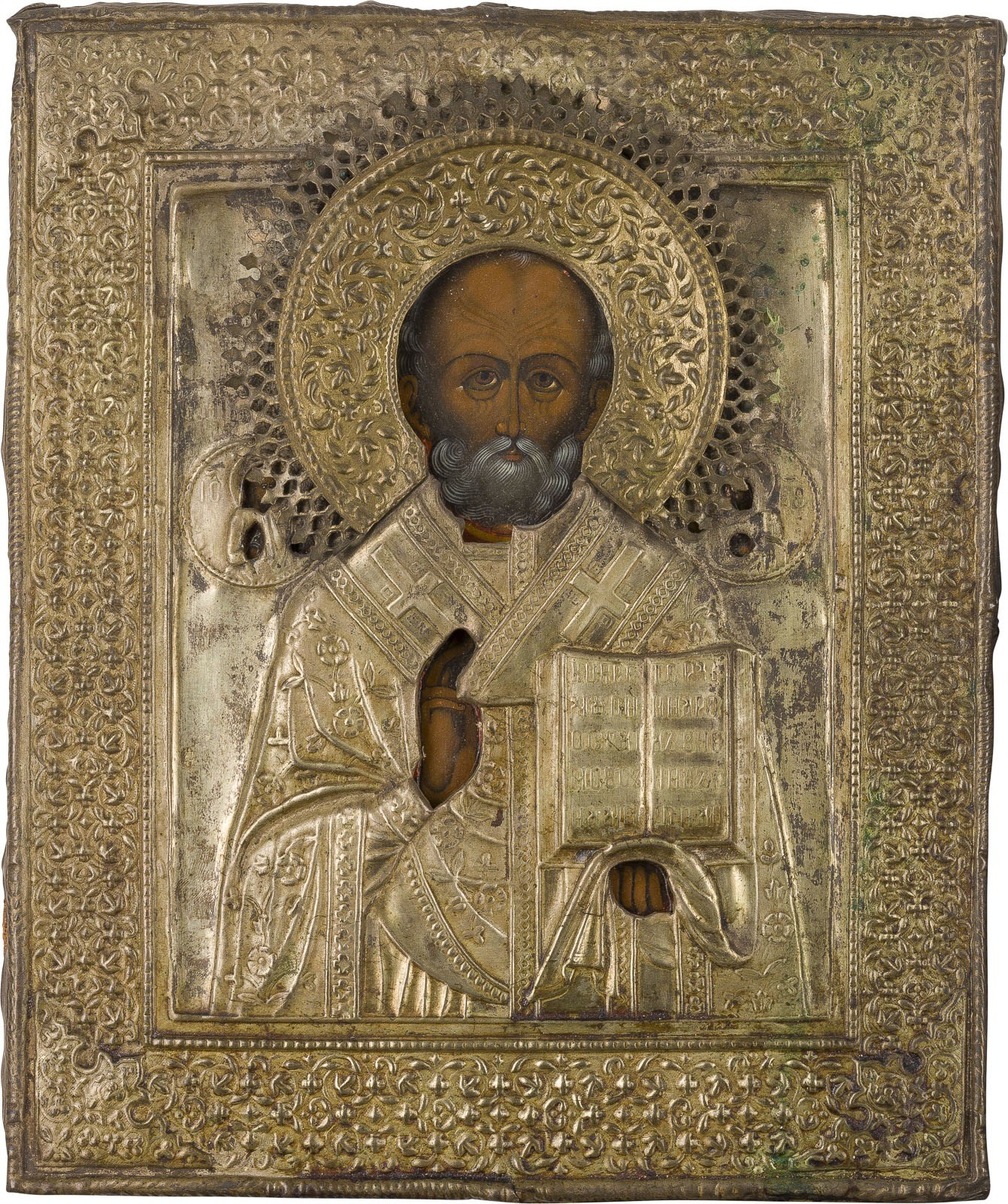 TWO SMALL ICONS SHOWING SOPHIA, THE WISDOM OF GOD AND ST. NICHOLAS OF MYRA WITH OKLAD Russian, 19th century Tempera on wood panels. The background made of silver, covered by a golden lacquer. One icon with two selected saints on the borders, the Guardian Angel among them. The brass oklad chased with foliage. Partially restored. 21.5 x 18.6 cm / 26.3 x 22 cm.