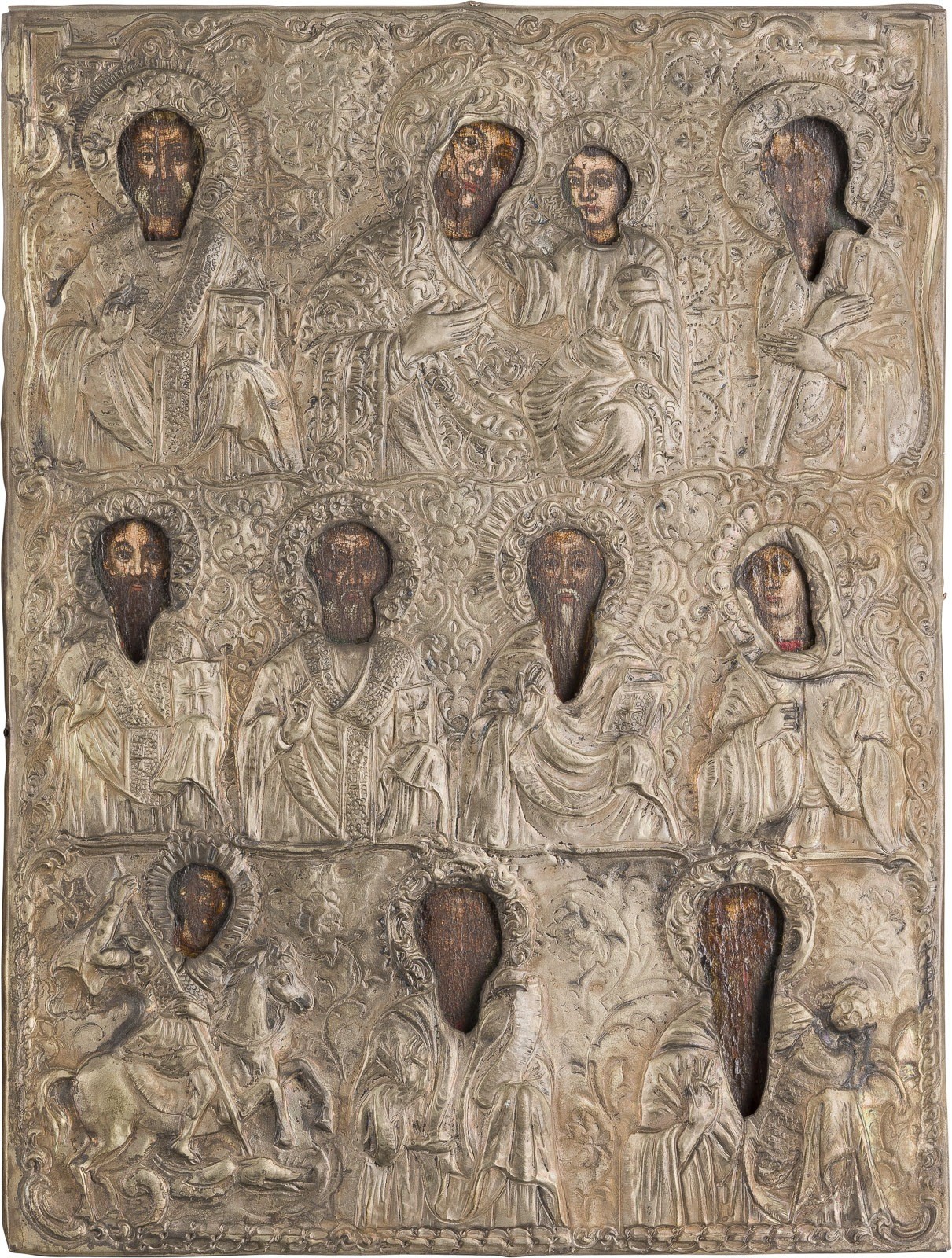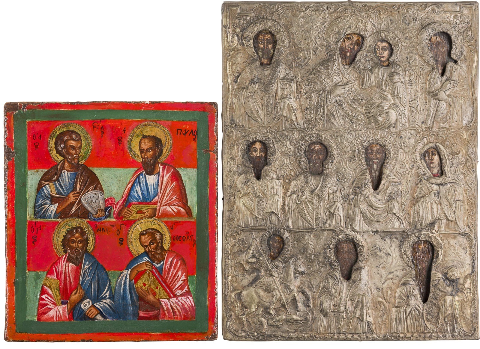 TWO MULTI-PARTITE ICONS SHOWING THE MOTHER OF GOD AND SELECTED SAINTS Greek / Balkans, 19th/20th century Oil on wood panels. The silver oklad chased and repoussé. Minor losses. 27.2 x 24 cm / 38.2 x 29 cm.