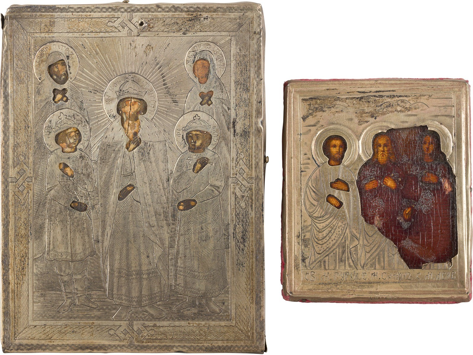 TWO MINIATURE ICONS SHOWING SELECTED SAINTS WITH SILVER OKLAD Russian, 2nd half of the 19th century (icons), Russian, Moscow, 1875 / late 19th century (oklads) Oil / tempera on wood panels. The silver oklads engraved with geometric motifs. Marked with city hallmark, assayer's mark, 84 standard and master's marks. Damages, losses. 6.8 x 5.8 cm / 10.9 x 8.2 cm.