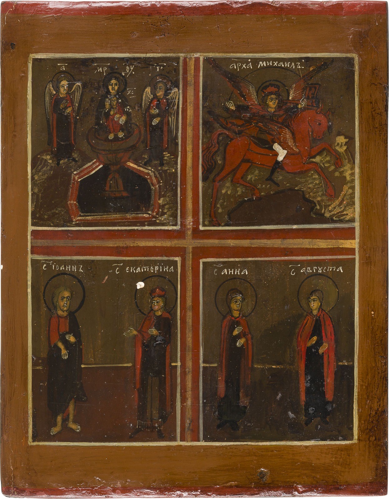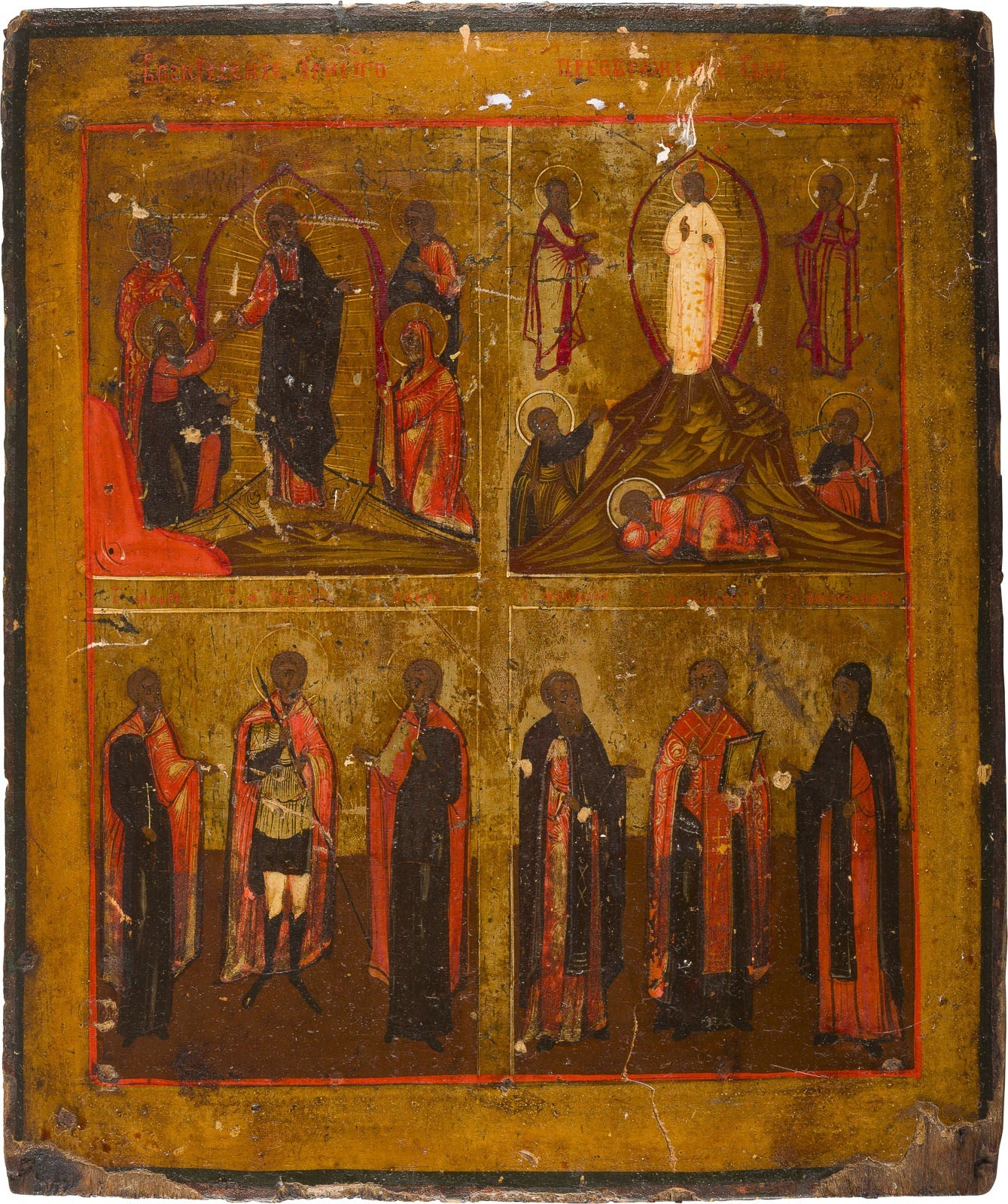 TWO QUADRI-PARTITE ICONS SHOWING FEASTS AND SELECTED SAINTS Russian, 19th century Tempera on wood panels, the background made of silver, covered by a golden lacquer. Losses, restorations. 28 x 22.2 cm / 30.7 x 26.3 cm.