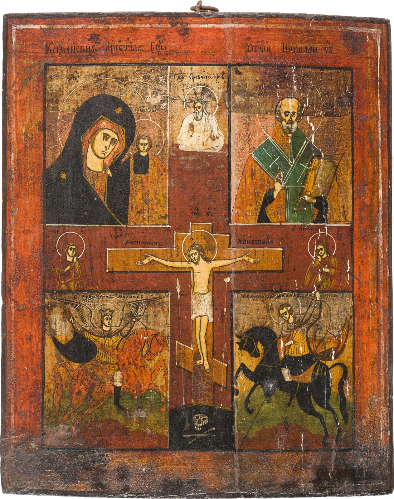 ZWEI VIERFELDER-IKONEN MIT DER KREUZIGUNG CHRISTI, DER GOTTESMUTTER VON KASAN UND HEILIGEN