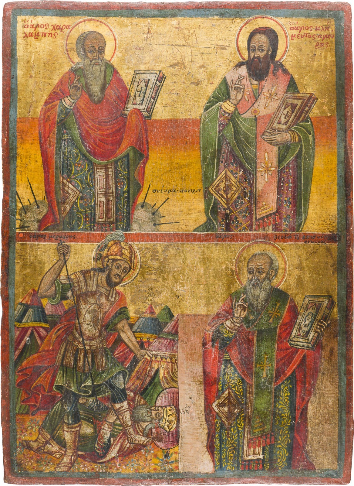 A TWO-PARTITE ICON SHOWING STS.CHARALAMPOS, CLEMENT, MERCURIUS, AND THEODORE Greek, mid 19th century Tempera on wood panel. Executed in bright colours on a gold ground. Partially restored. 43.4 x 31.8 cm.