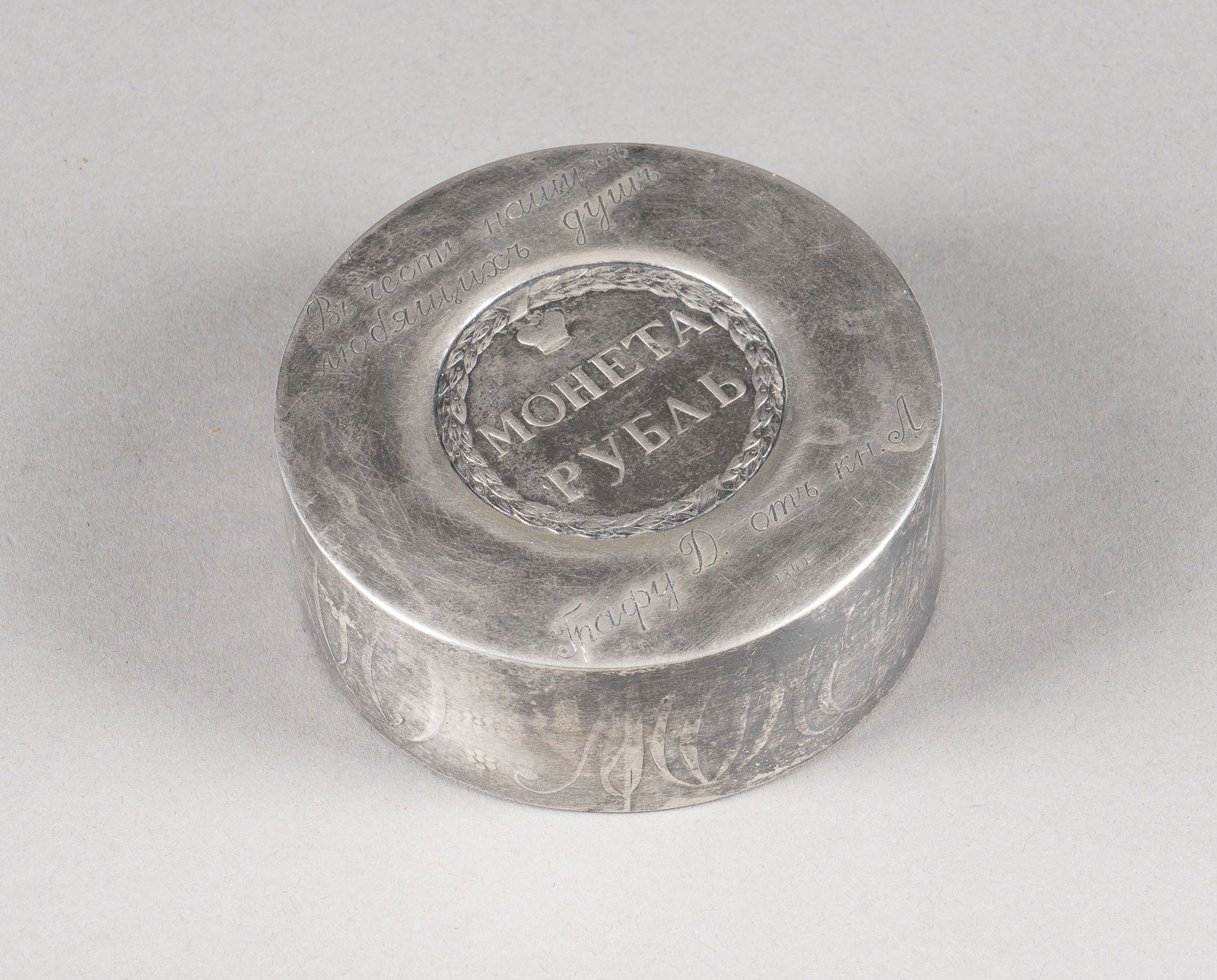 A MASSIVE SILVER GIFT COIN AFTER THE 'SESTRORETSK ROUBLE 1771' Russian, 19th century A dedication in Cyrillic: 'In honor of our loving souls. To Count D. from Pr. L. 1849'. Diam. 7.1 cm, 1090 gr.