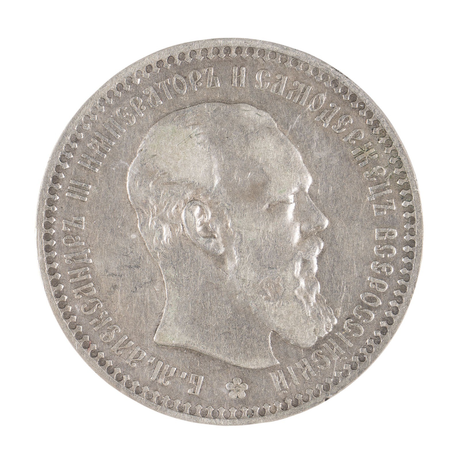 A ROUBLE COIN WITH THE PORTRAIT OF ALEXANDER III Russian, 1892 Silver. Diam. 3.5 cm, 19.8 gr.