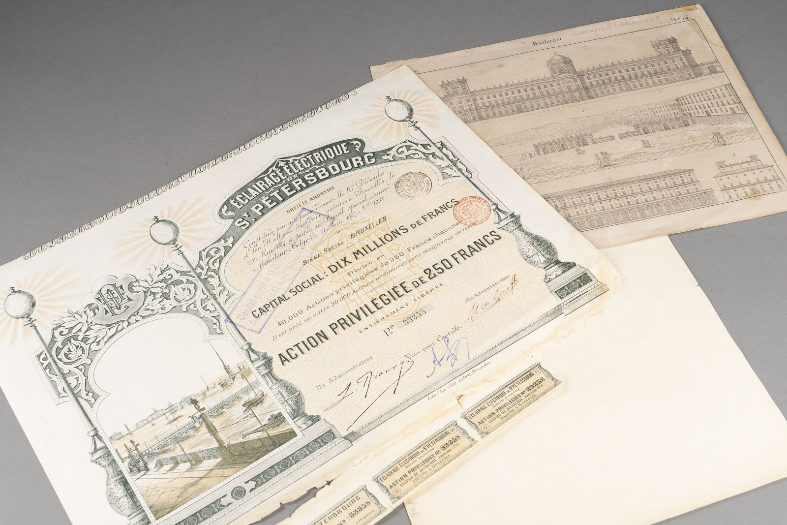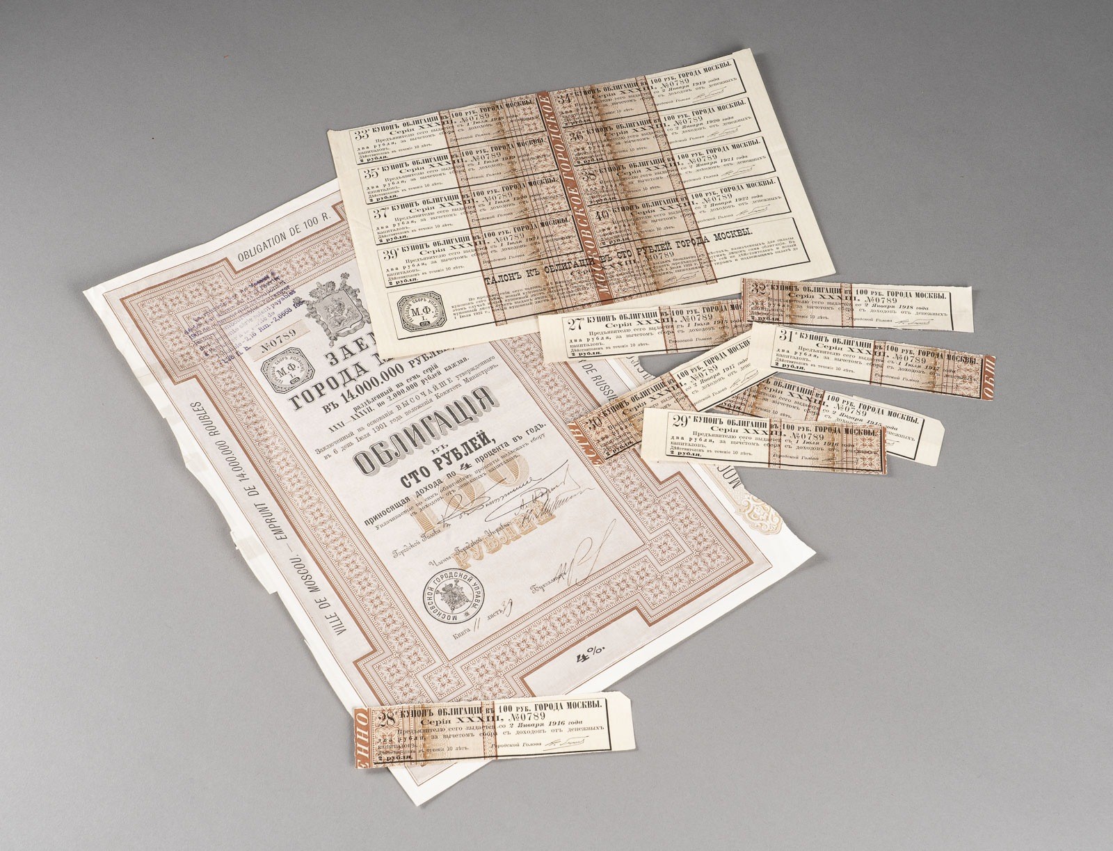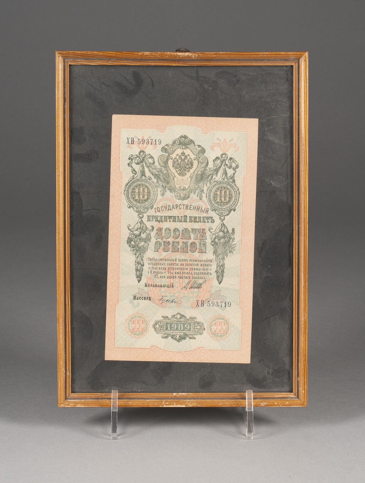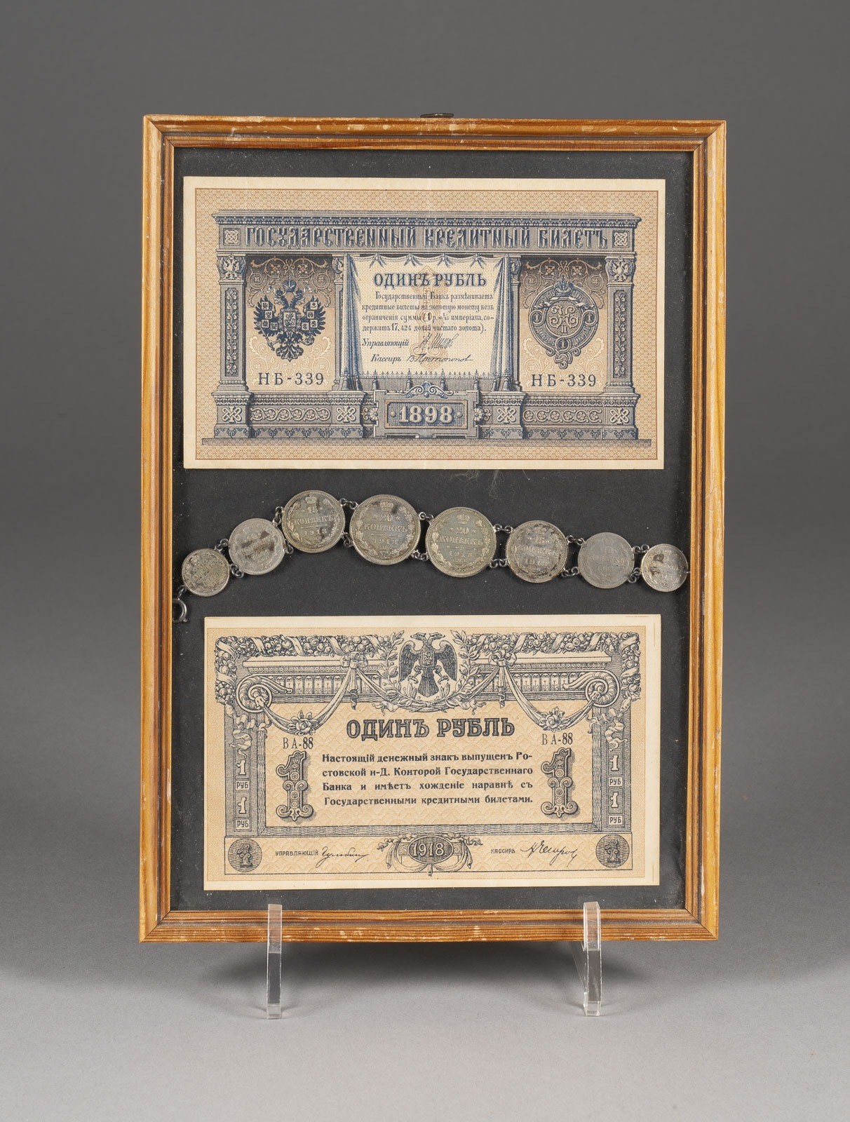 A COLLECTION OF 13 BONDS, BANKNOTES AND KOPECK COINS Russian/Belgian, 1898-1918 Paper/silver, part. framed behind glass. L. 14.2-39.5 cm, diam. 1.5-2.3 cm. Lithograph with architectural view included (German, 1st half of 19th century). Partially browned, part. torn.